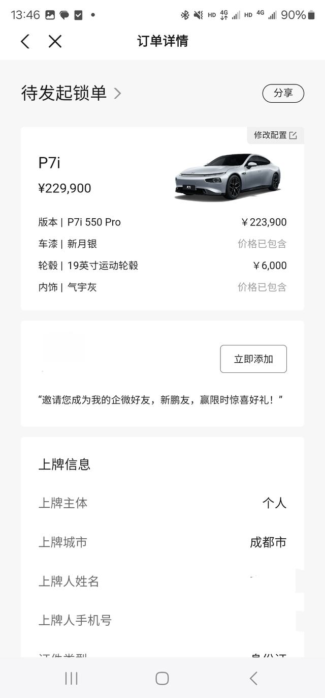 给大家汇报下 下单小鹏p7i 买车真的是一个艰难的旅程 从看15万左右的哪吒心动 到已经准备交钱了零跑c11 价格已经谈到了15w落地 到后面发现零跑对面有台小鹏G6好帅 寻思加个几万要不买小鹏g6 把和我聊了一天的零跑销售扔在风中凌乱 到最后无意间试驾了下小鹏p7i 一路从15w看到20w 这个心路历程 好艰难 人生第一辆车 这台车是最低配 大概落地价在20w左右 加上所有的补贴