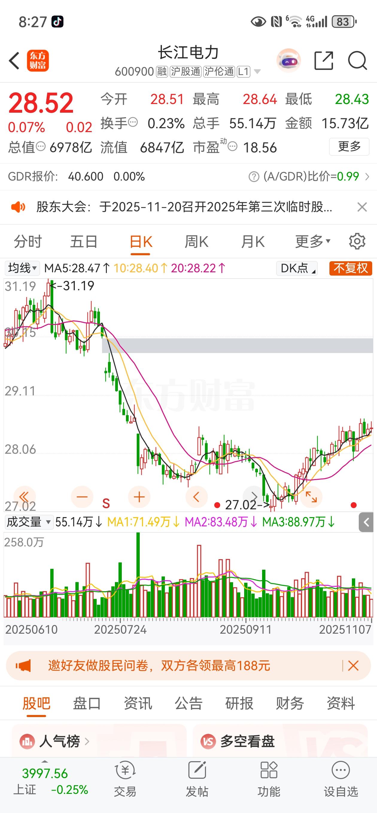 三峡集团融资增持长江电力的操作简直是一举多得的妙招! 长江电力经历了8,9月份的调整以后,迎来了止跌企稳的走势,股价重回28元。 大股东三峡集团最近公告,已经完成了一部分融资增持长江电力的操作。长江电力股价在利好消息的刺激下,走势越来越稳健。 三峡集团的增持是一桩确定性很好的生意,他可以不动用自有资金的情况下,可以以2%以下的低利率拿到贷款。而长江电力每年的分红可以至少达到3.5%以上,利差可以赚1.5%以上。 同时大股东回购利好的刺激下,股价也会拉升,进一步提高了大股东的持股价值。长江电力的小散们也高兴,大股东都增持了,小股东也可以跟着喝喝汤。银行也可以从这裝生意赚到巨额利润。 三峡集团的一举多得的操作,市场还是很给面子的,长江电力迎来了估值修复。希望我们的A股多一些这样的公司,让A股迎来真正的繁荣!