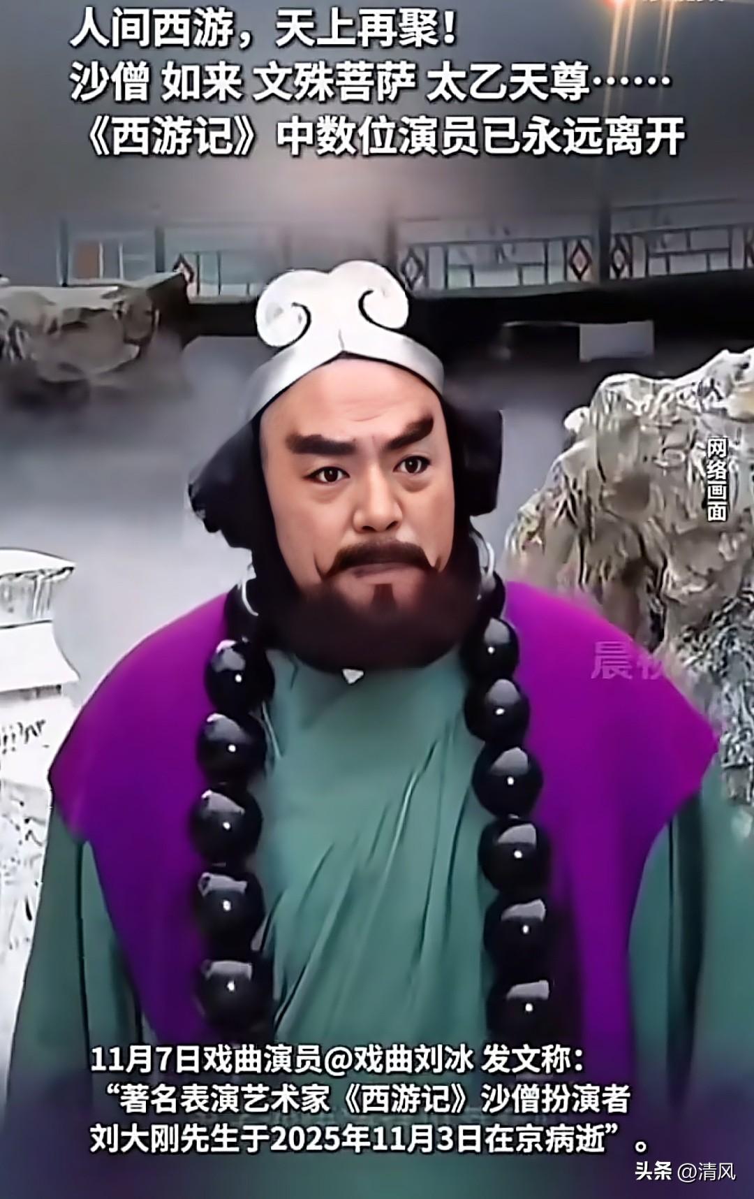 两代沙僧都走了!《西游记》这些熟悉面孔再也见不到 刷到刘大刚老师病逝的消息,心里一下空落落的。 这位《西游记续集》的沙僧扮演者,11月3日在北京离世,享年78岁。 还记得他为贴合角色,在担子里加10块砖增重,5公斤佛珠、3两重耳环戴一整天都不抱怨。 而86版沙僧闫怀礼老师,早在2009年就已离世,两代沙僧都化作了回忆。 这些年,如来佛祖朱龙广、导演杨洁、赵丽蓉老师饰演的车迟国王后,还有玉皇大帝、弥勒佛的扮演者,都陆续离开了我们。 近40年过去,剧里的取经路还在循环播放,可那些塑造经典的人却在慢慢退场。 人间西游,天上再聚。 你最怀念他们饰演的哪个角色?