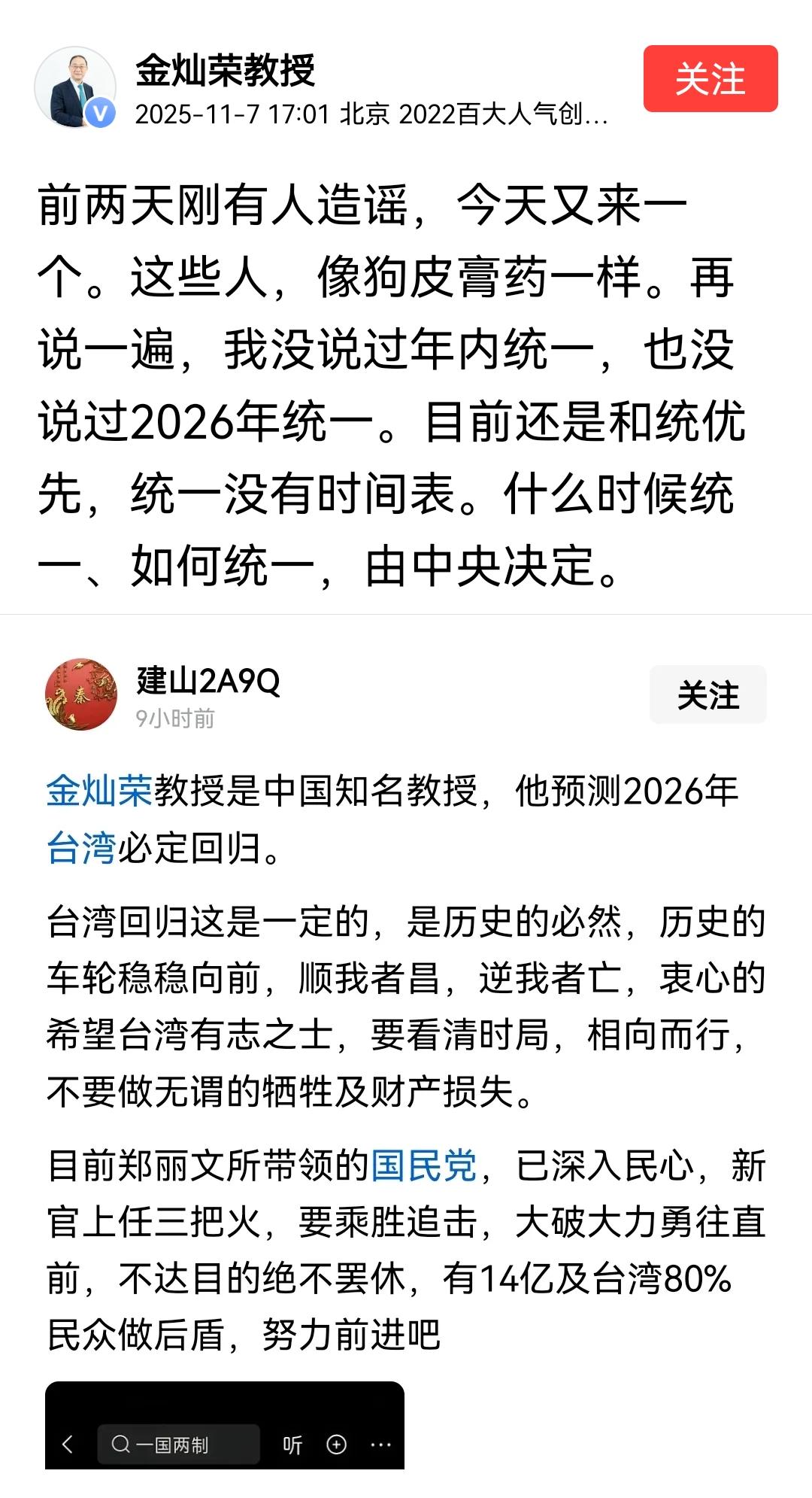 金灿荣教授出来避谣了 金灿荣教授说,这几天总有人打着他的名号发布一些不正当的言论来蹭热度蹭流量,特别是在对两岸关系的一些敏感词和话题上更是断章取义和搬弄是非。 对此,金灿荣教授很生气! 作为互联网大伽,金灿荣教授的一些点评和观点一直在网络上被引为是风向标,所以,很多网友就借打着金灿荣教授的名号就一些话题夸大了事实的真相来撰写,妄顾事实。所以给金灿荣教授带来了一定负面的影响! 如今,金灿荣教授亲自出来避谣,也希望大家客观陈述事实,不要借用“金灿荣教授”的名号搬弄是非,撰写一些没有事实根据的事!这样会引起不必要的争议和麻烦。条友这一周 分享我这周有趣的事:
