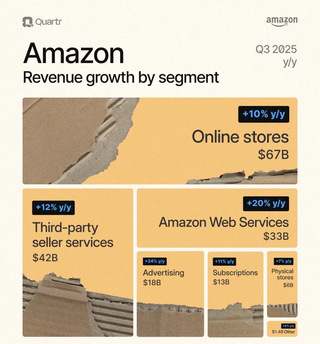 2025年第三季度,亚马逊展现出全面复苏与多元化增长的强劲势头。整体营收在六大板块中全线增长,尤其是云服务与广告业务的爆发,使公司继续巩固其全球电商与云计算双王者地位。