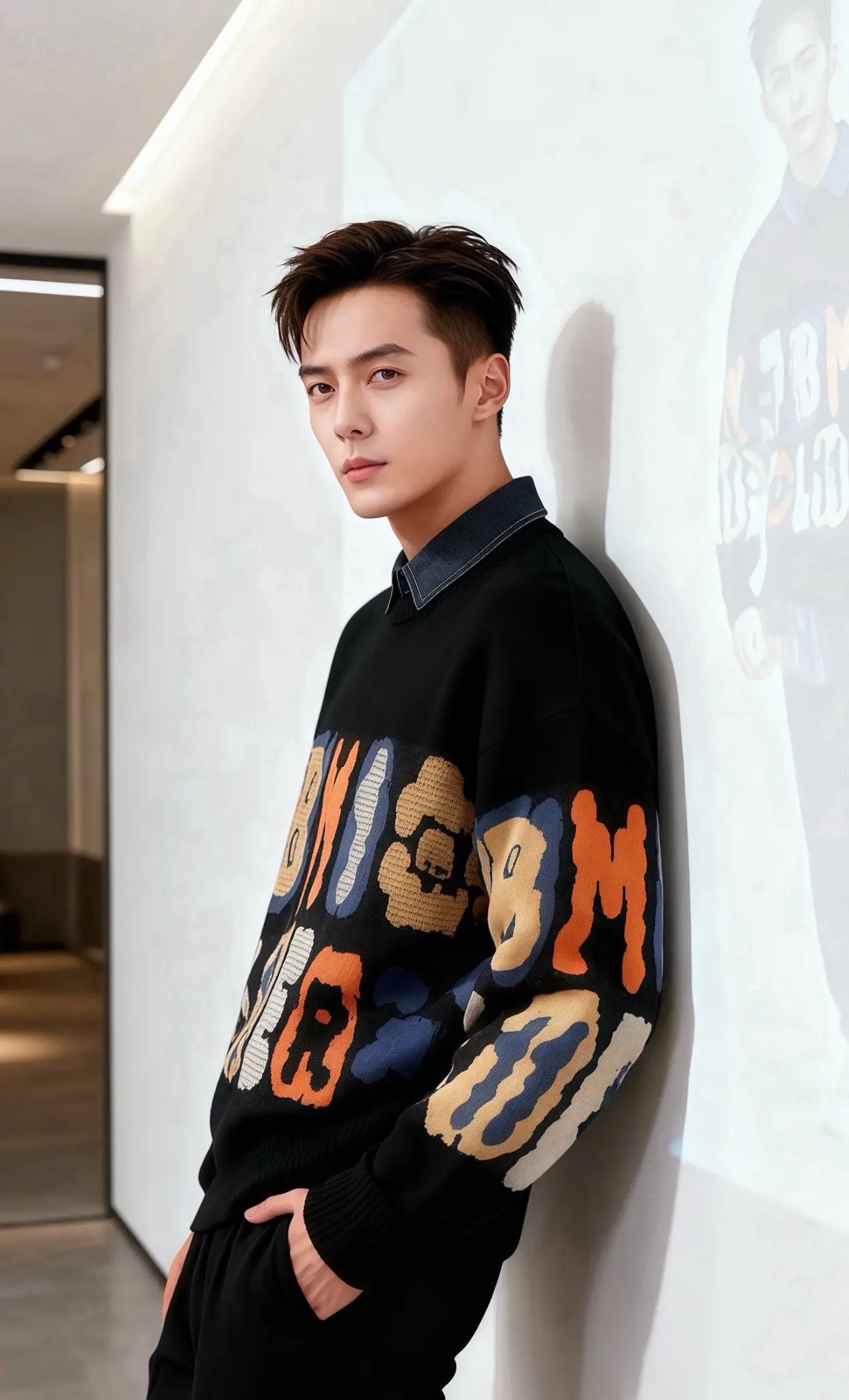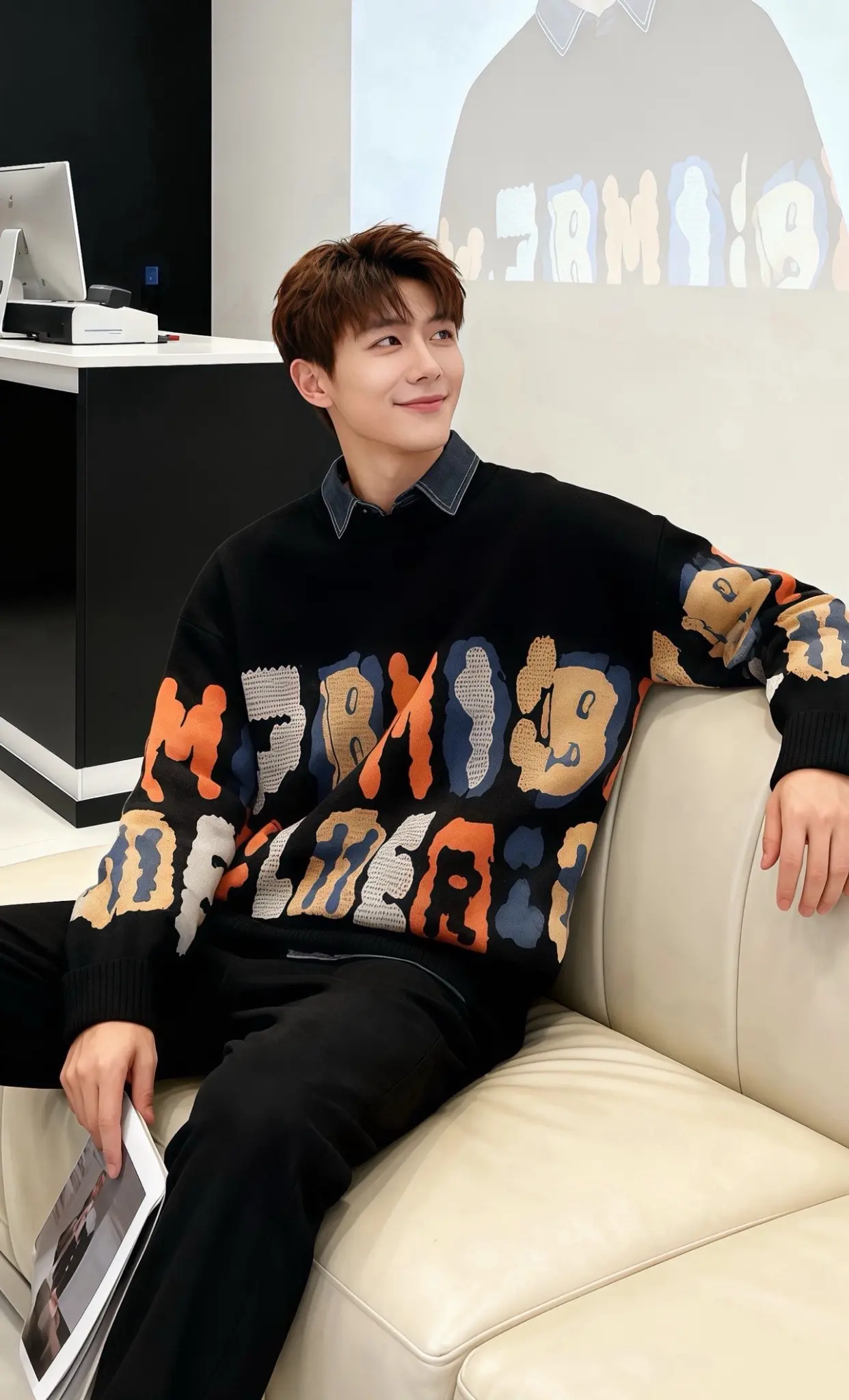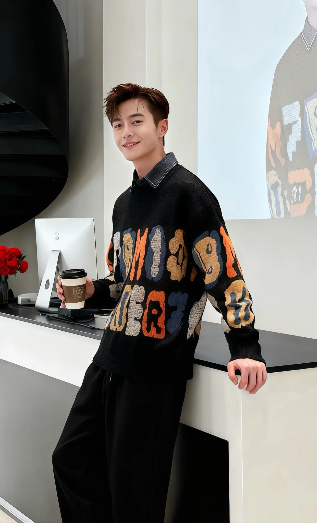 初雪落满巴黎街道那天,我在橱窗撞见穿同款毛衣的他——黑底衬着橙蓝撞色字母,牛仔领像偷来的少年气,指尖正点着模特身上一模一样的纹路,笑出梨涡。