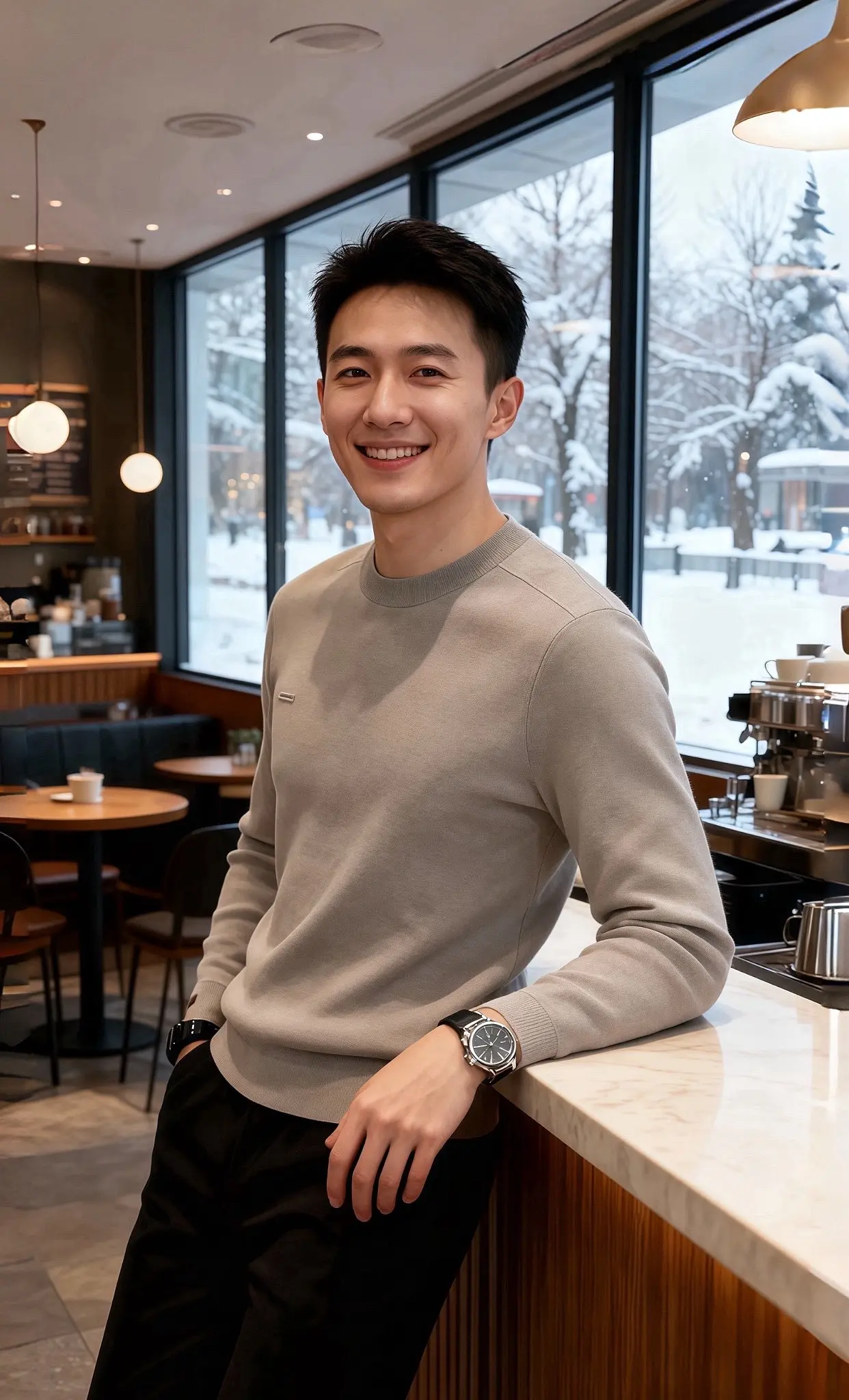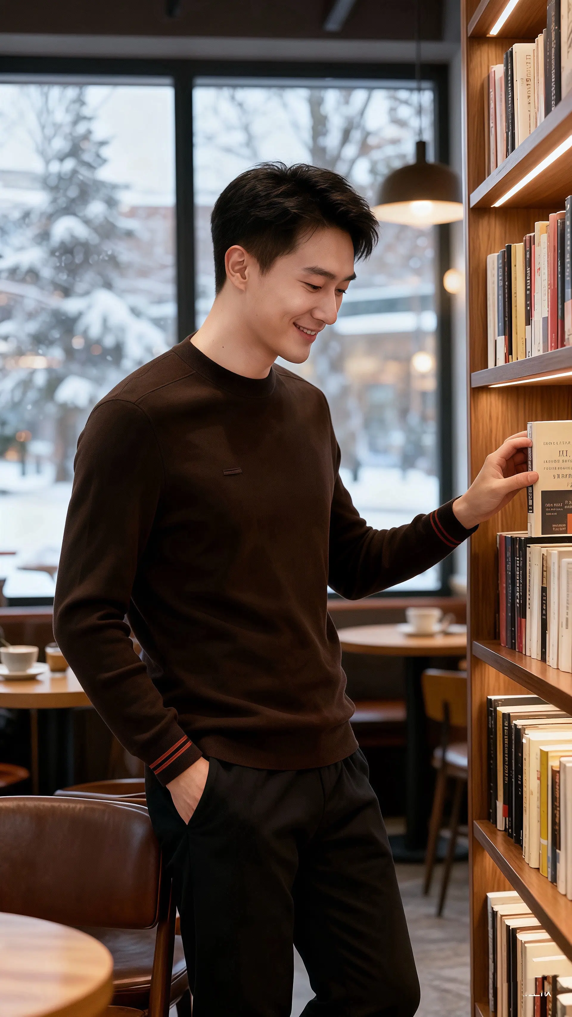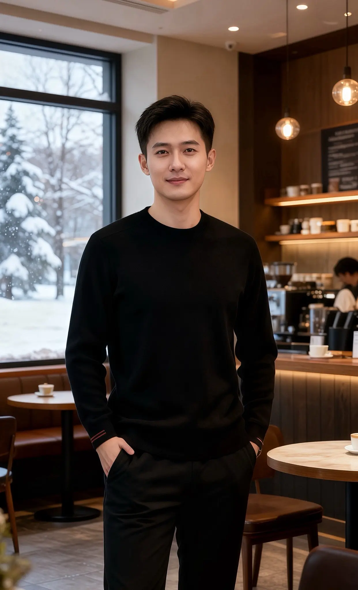 《雪窗下的暗纹暖意》 落雪裹住街景那天,我在咖啡馆吧台撞见他——黑色针织衫的袖口缀着两道细红纹,像把冬风里的热意缝在了布料里,简洁的版型衬得肩线利落又温和。 后来他倚在书架旁挑书,深棕针织衫裹着暖光,胸口的小暗纹落在书脊间,像藏了半段没说出口的话。“这件的针脚是斜纹织的,”他指尖碰过书脊,“设计师说,是‘刚好接住温度’的松弛。” 此刻他靠在雪窗前,黑裤与针织衫的搭调里,袖口红纹晃得我心跳轻颤。原来好的穿搭和心动一样,不用多余装饰,只那道暗纹、那抹色调,就刚好落在了审美里最软的地方。