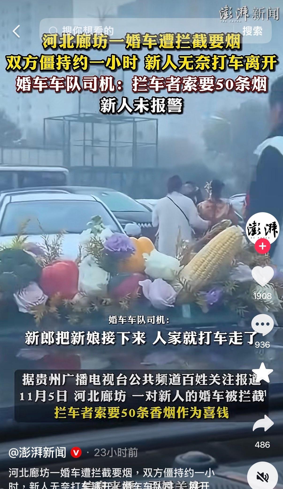 你们看到这个了不!截婚车跟人要五十条香烟的… 我们前段时间去廊坊参加朋友婚礼,就是这样!她提前跟我们说了,那边截车很严重,都是陌生人,看到有人结婚就去截头车 一个是有习俗,一个是有吉时,还有新郎新娘脚不能沾地啥的,反正很多结婚的人就会想省事或者怕不吉利就给了! 有些很过分的,比如一车要好多条烟那种,有些就不惯着,会同意打起来,还有新郎新娘自己下车直接骑电动车走的 然后河北一般都早上六七点接亲,她们那边为了躲截车的就会半夜接亲,我朋友就是玩完游戏半夜一点多出发的,然后第二天中午典礼! 我朋友说她头车被截了11条… 我们坐的那辆车当时没遇到,但是一上车那个司机就说了,后排也都系好安全带吧!我们这开婚车会很快! 路上果然,不是按照一长溜那样开的,开特别猛,最高都一百来迈了,而且特别F1狂飙飞车….有对讲机,随时警惕截车的,随时变换队形……特别震撼…… 我朋友说她们村好多年前还有为了躲截车的,开太快了然后从桥上飞出去了………..啊啊啊啊啊