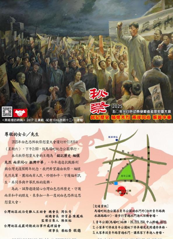 11月8日下午就是一年一度台湾白色恐怖受难者慰灵秋祭,典礼将在台北马场町举行,刚