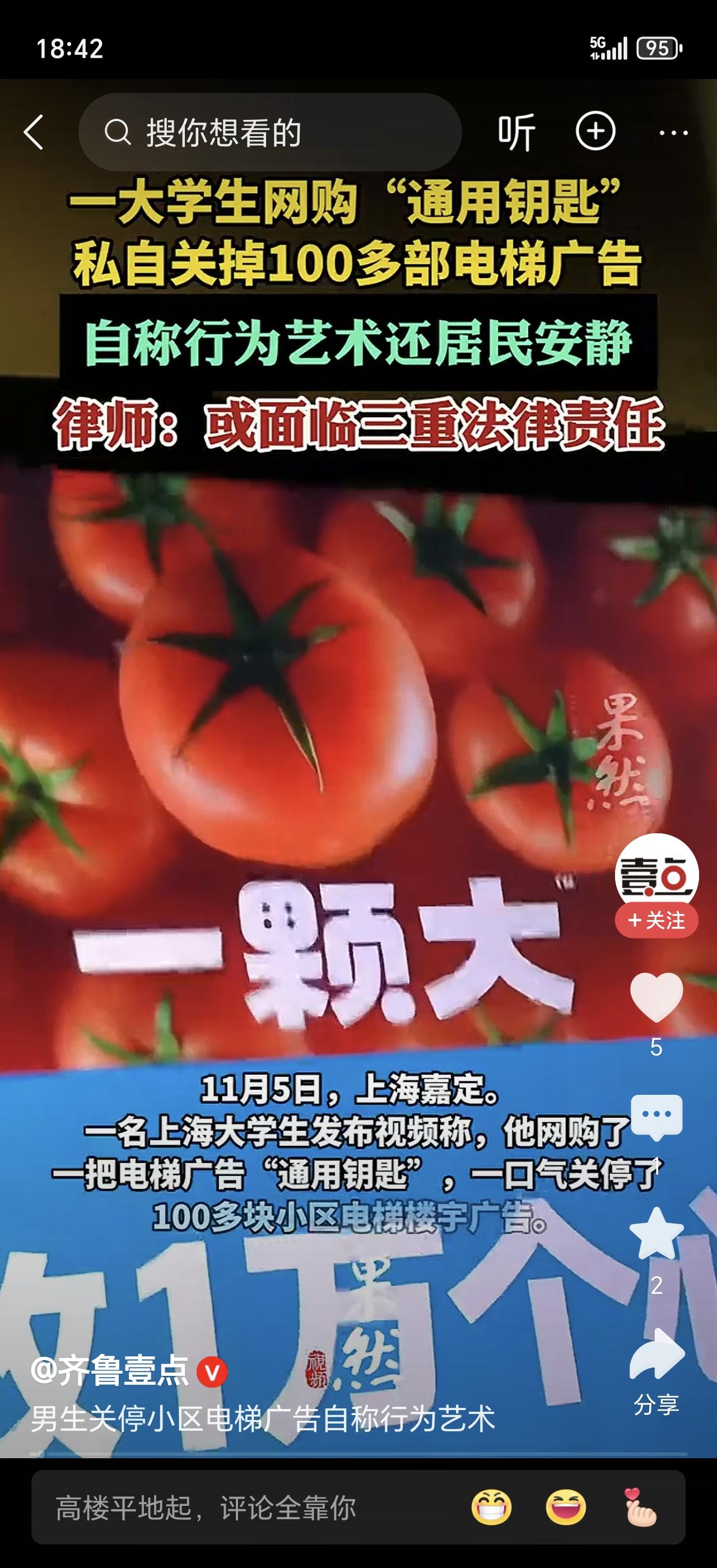 电梯广告被关居然是“行为艺术”?大学生这波操作也太颠覆认知了! 小区居民突然发现电梯广告全停了,查了才知道是几名大学生干的,理由是广告扰民,这是他们的“行为艺术”。 有人觉得广告循环播放确实烦,这波操作解气;但更多人吐槽不妥——想反对广告可以找物业沟通,私自强行关停,反而影响居民正常出行,还越界了。 理解反感扰民广告的心情,但“行为艺术”不能没边界,维权得守规则。遇事找对方式,才不会好心办坏事! 电梯危害 电梯文明行为