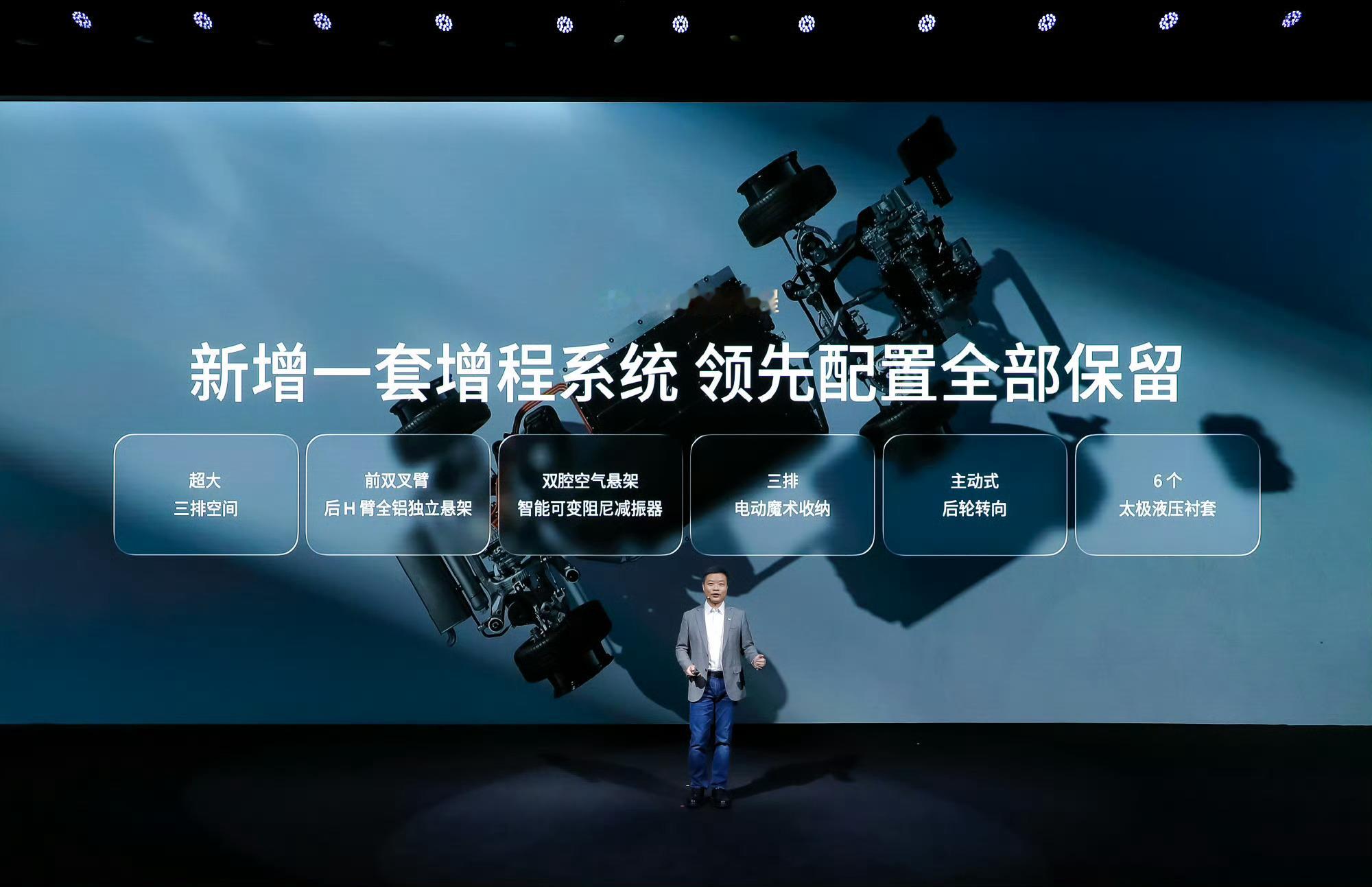 该技术搭载增程专用超快充磷酸铁锂大电池与60L油箱,实现CLTC纯电续航452公里、综合续航1602公里,并支持800V超充,12分钟可补电70%。第三代1.5T高效增程器在亏电状态下仍能维持高速稳定行驶。通过全栈高集成高压油冷发电机与智能能量管理系统,能耗较同级降低15%。增程器采用超静谧设计,结合主动降噪,噪音控制显著提升。