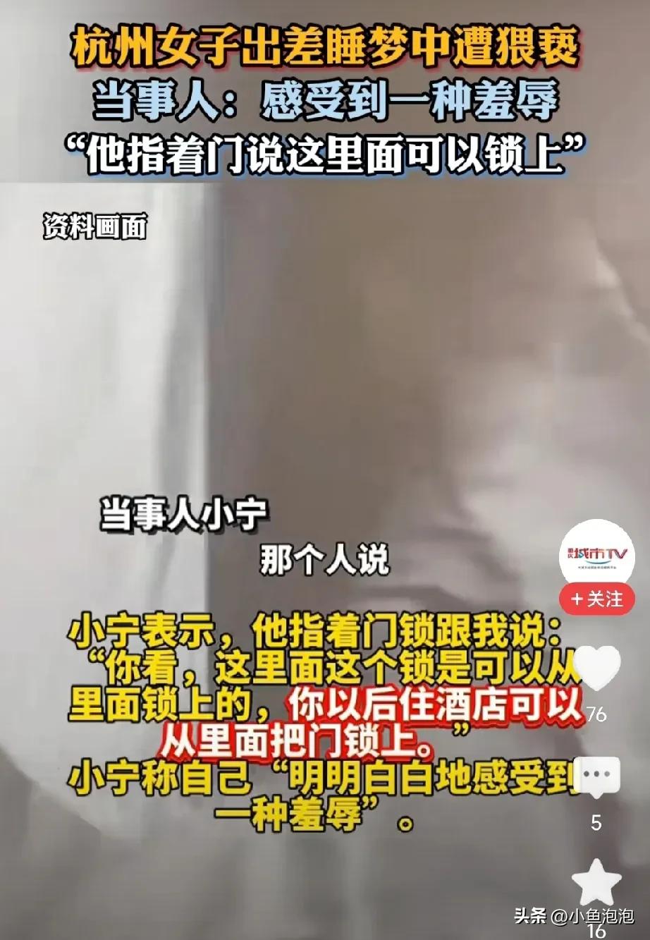 杭州一女子出差住酒店,半夜被子突然被掀开,她惊醒后发现身旁,竟躺着一个陌生男人,对方见女子醒了,赶忙说,别开灯,是我,金老板。女生吓得躲进卫生间,没成想,男子接下来的举动更过分。 当事人小宁(化名)称,睡梦中感觉有人脱其内裤并蹭下体,惊醒后见陌生裸男,对方自曝是金老板,她当即躲进卫生间。 更过分的是,金老板指着门锁对小宁说“以后住酒店可以从里面锁门”,小宁直言感受到强烈羞辱。 此事性质恶劣,金老板仗着身份对下属行龌龊事,既违背道德,更涉嫌违法。 职场中类似乱象并不少见,部分所谓“领导”将权力视为特权,把下属当作可随意拿捏的对象。小宁事件曝光后,网友反响强烈,有人呼吁严惩金老板,也有人担忧小宁会因此丢了工作,受害者要顾虑饭碗,施暴者却可能仗着身份逍遥法外,这显然不合情理。 与此同时,酒店安保问题也引发关注。一个成年男性何以能悄无声息进入女性客房?酒店的安保措施是否形同虚设?今后大家住酒店,还能安心入睡吗? 小宁的遭遇令人揪心,睡梦中被侵犯的恐惧、事后被羞辱的愤怒,任谁都难以承受。在此提醒所有女性,外出务必做好自我保护,住酒店锁好门是基本操作,若遭遇此类侵害,千万别忍气吞声,应果断报警、依法维权,绝不能让坏人得逞。 各位读者,对于这件事你们有什么看法?欢迎在评论区聊聊。