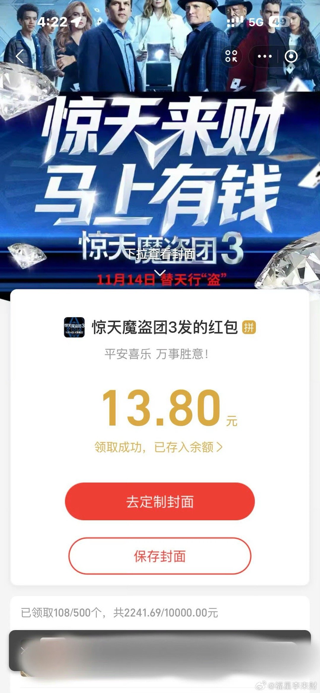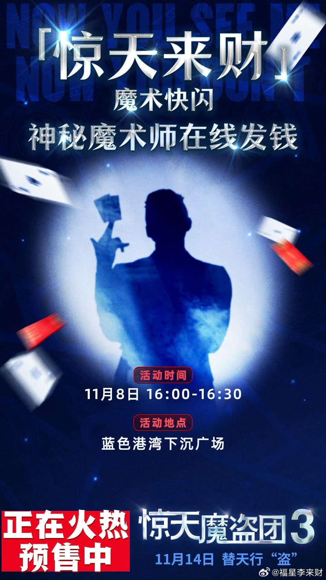 惊天魔盗团把我当自己人宠了 谁懂啊!《惊天魔盗团3》线下快闪直接现场发钱,预售线上撒完线下接着宠,这电影界财神爷是实锤了,11.14上映必须冲,看完说不定就暴富!