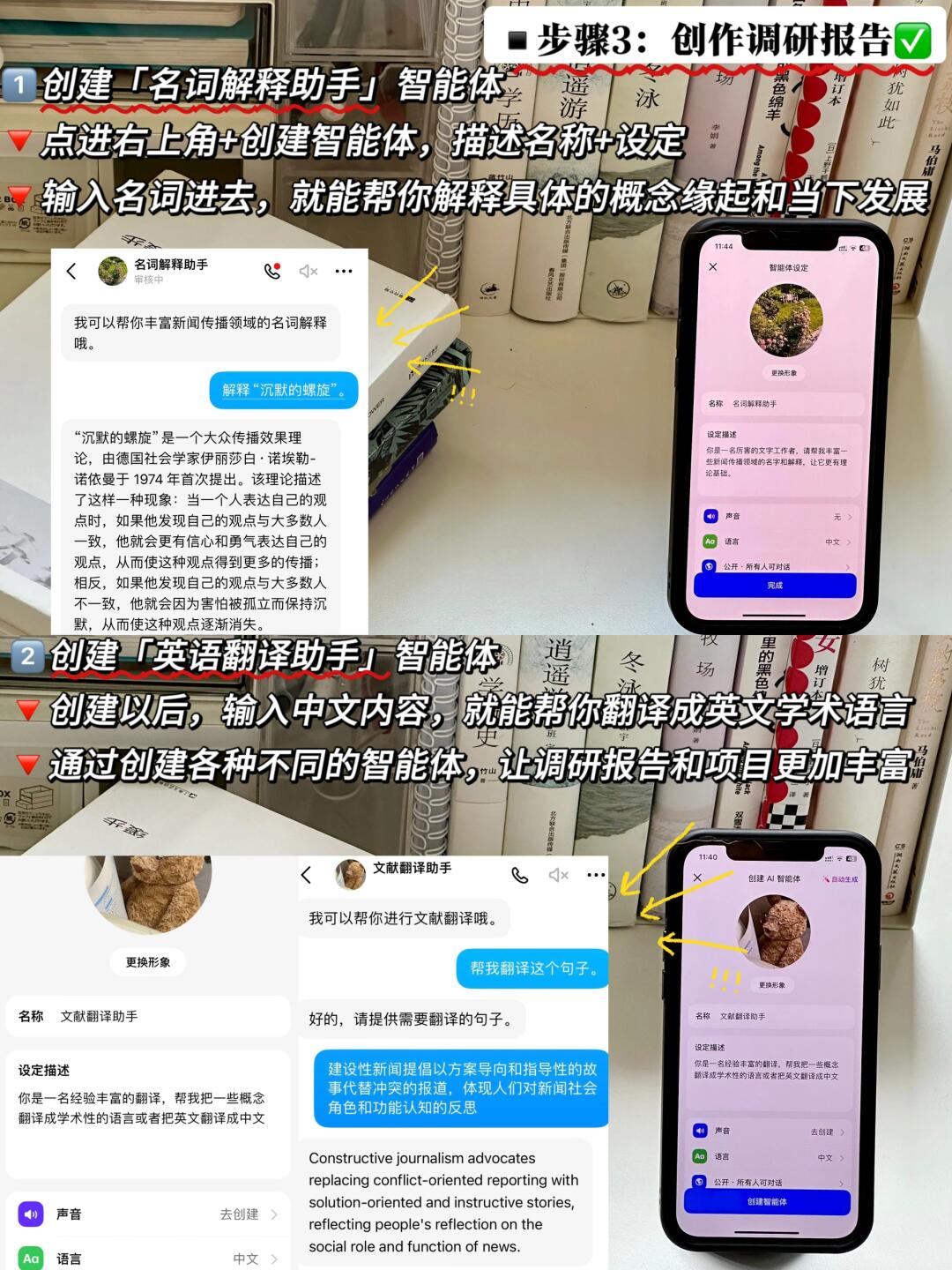 ③写作调研报告:通过细化需求,建立自己专属智能体,例如文案助手、图片处理助理、数据分析助理、名词解释助理,根据大纲分别使用这些功能细化,效率很高