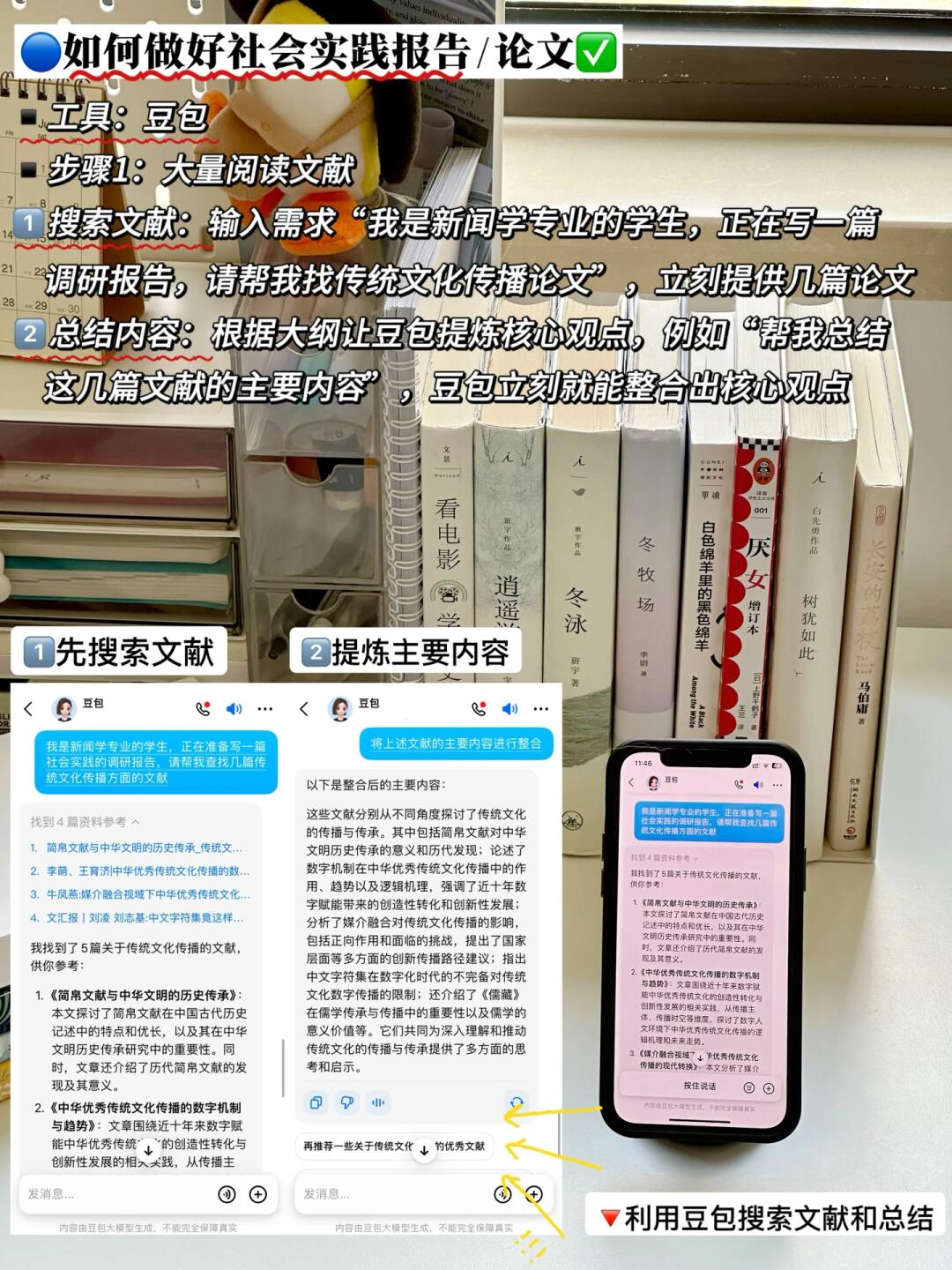 ①大量阅读文献:直接在对话框输入“我是新闻学专业,正在准备写调研报告,请帮我查传统文化传播文献”,立刻呈现专业信息资源,并追问提炼总结重点