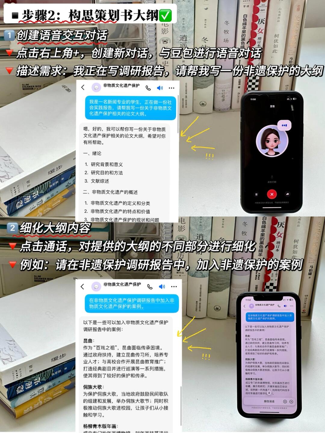 ②构思策划书大纲:创建对话后打开语音交互,描述你对策划书需求,“我想写非遗保护调研报告,请帮我提供大纲”,通过不断追问丰富大纲