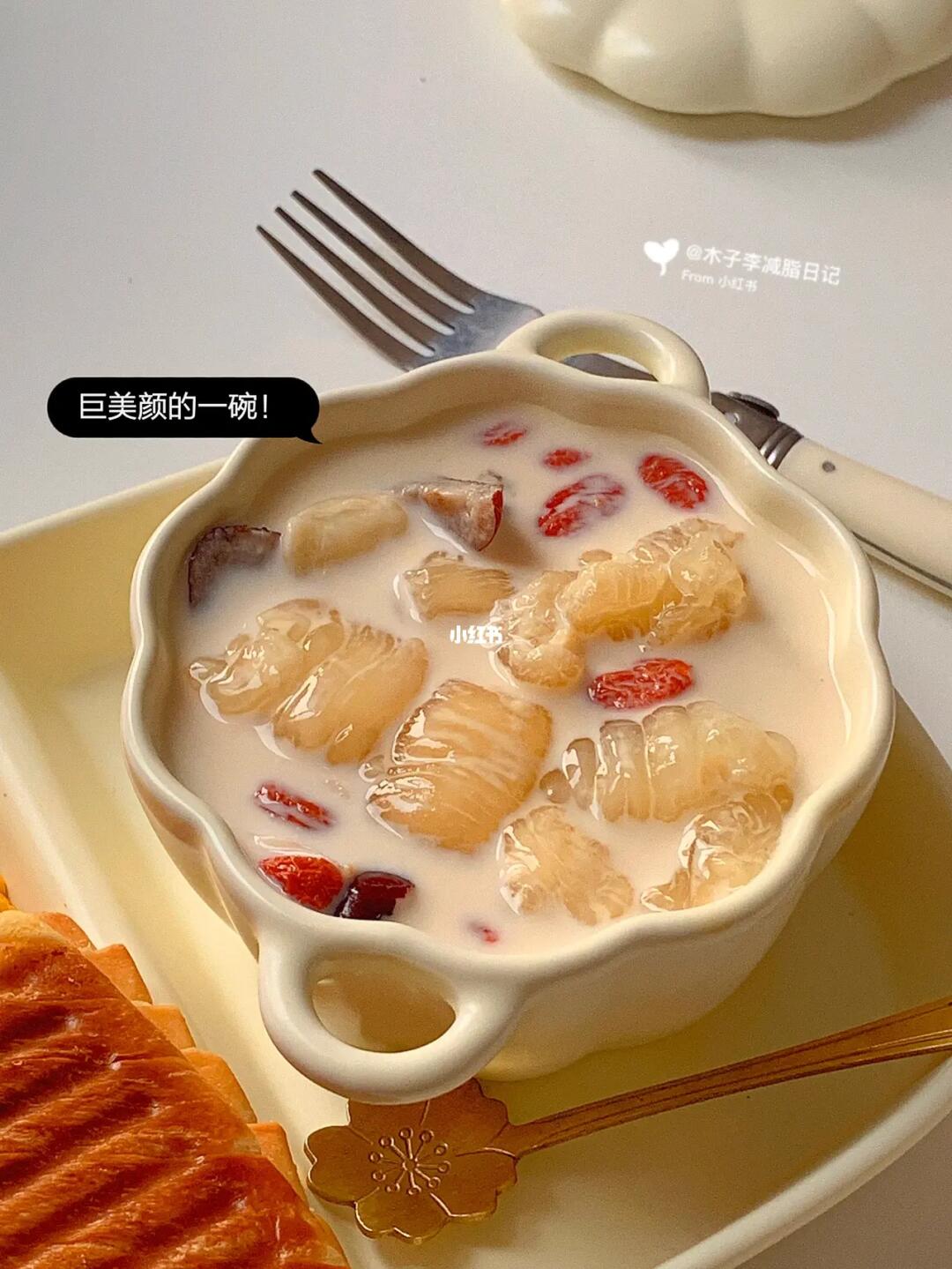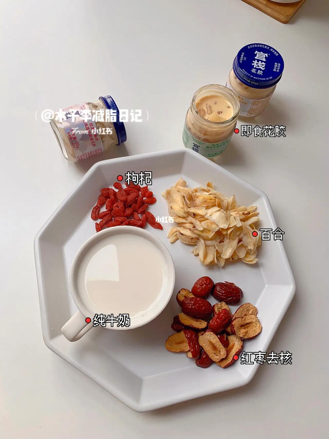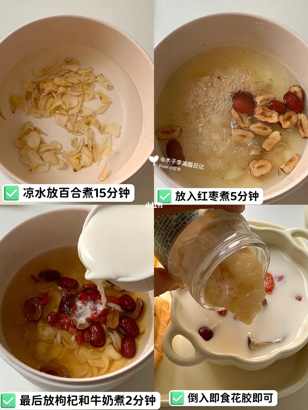 ▪️百合洗干净凉水下锅煮15分钟,再把红枣放进去煮5分钟,之后加上枸杞和牛奶煮2分钟,盛出后倒入即食花胶即可食用了!