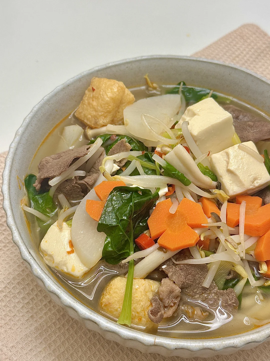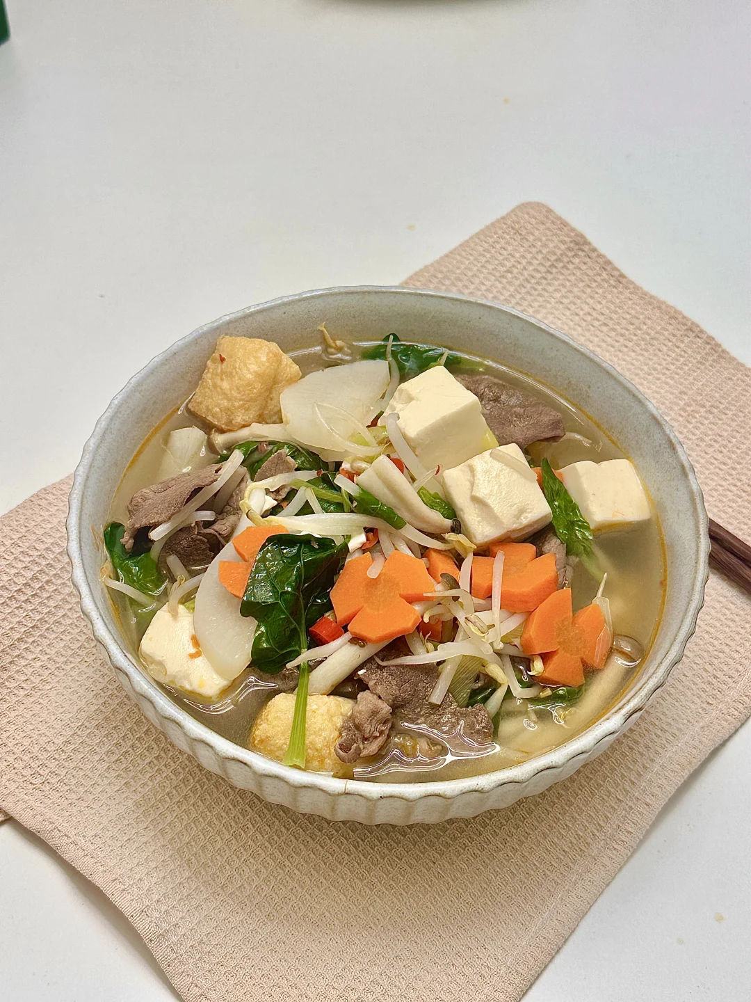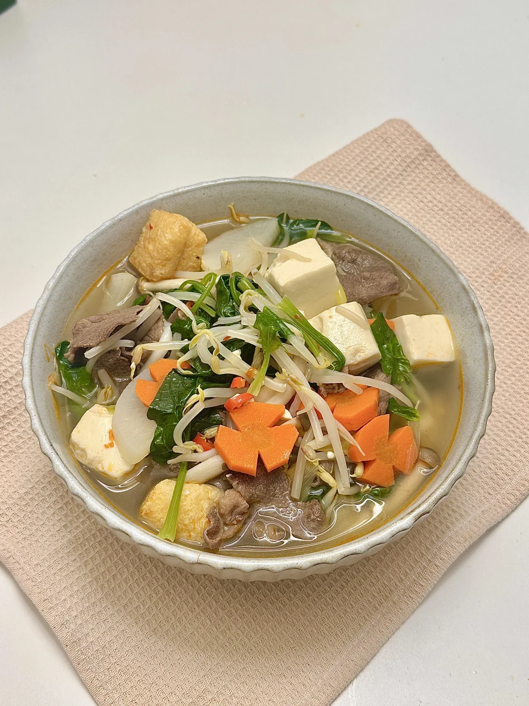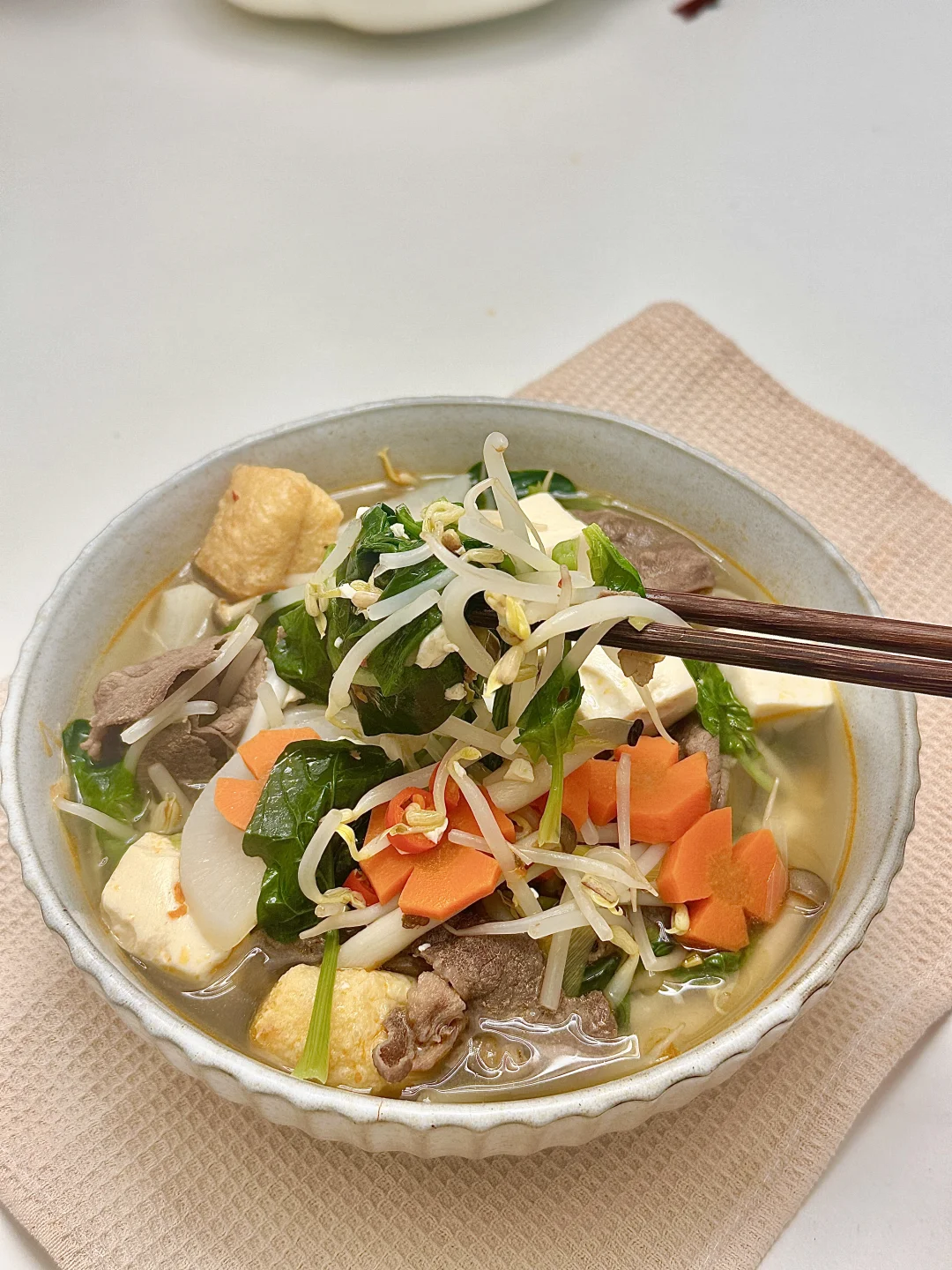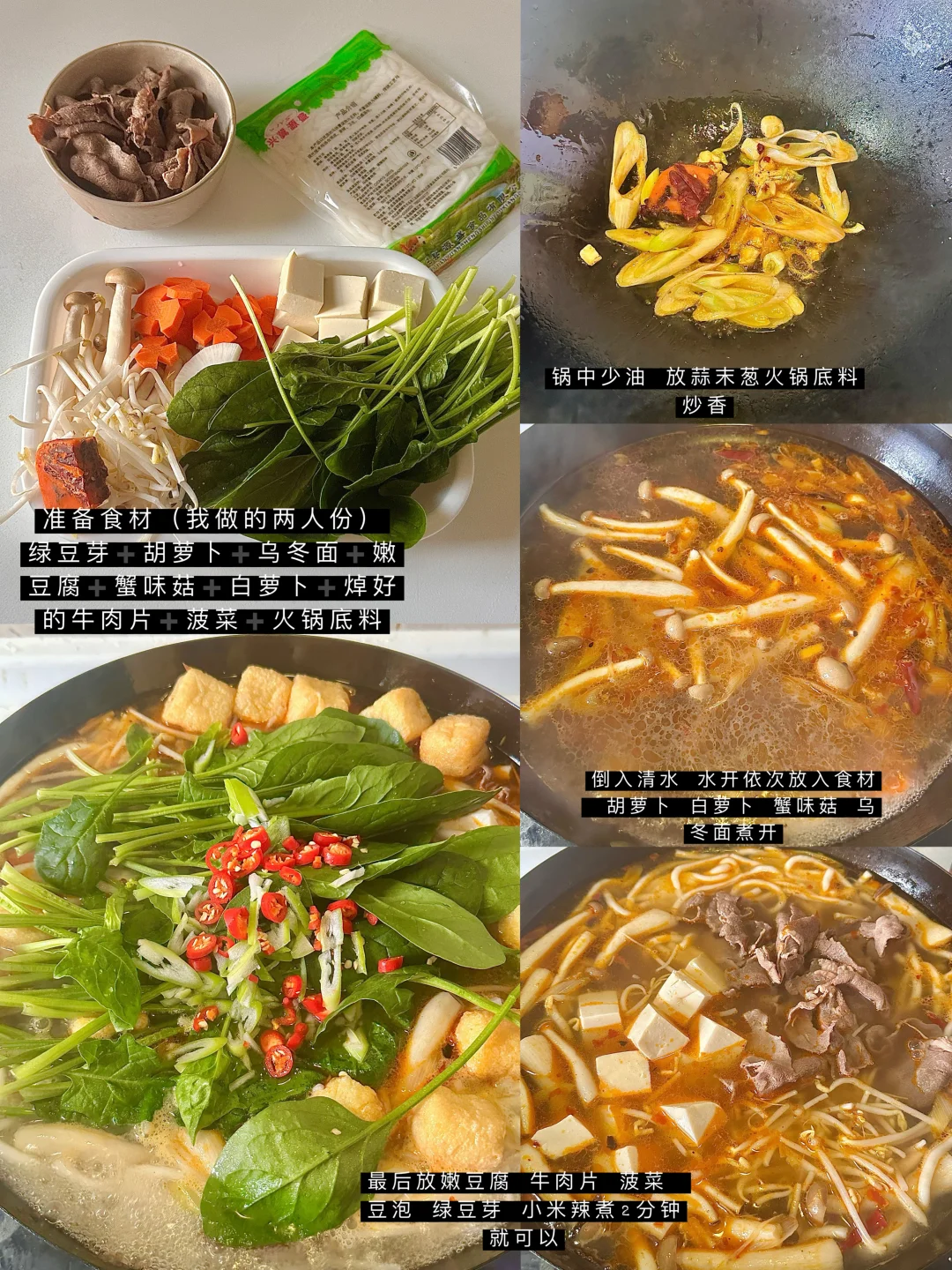 突然的降温❄️只想吃点热乎有汤水的食物 ,所以今天吃烫水煮菜乌冬面 ,加了超多的蔬菜还有牛肉片好吃又健康,一碗下去无负担超满足的!放了火锅底料 汤就少喝些吧! - 👨🏻🍳做法: 1️⃣牛肉片先焯水备用 2️⃣热油把葱蒜火锅底料炒香 倒入适量清水 3️⃣水开放入胡萝卜 白萝卜 乌冬面 蟹味菇煮开 4️⃣最后放牛肉片 绿豆芽 菠菜 豆泡 小米辣 嫩豆腐 煮2分钟即可! 轻轻松松一锅出~快去试试吧!