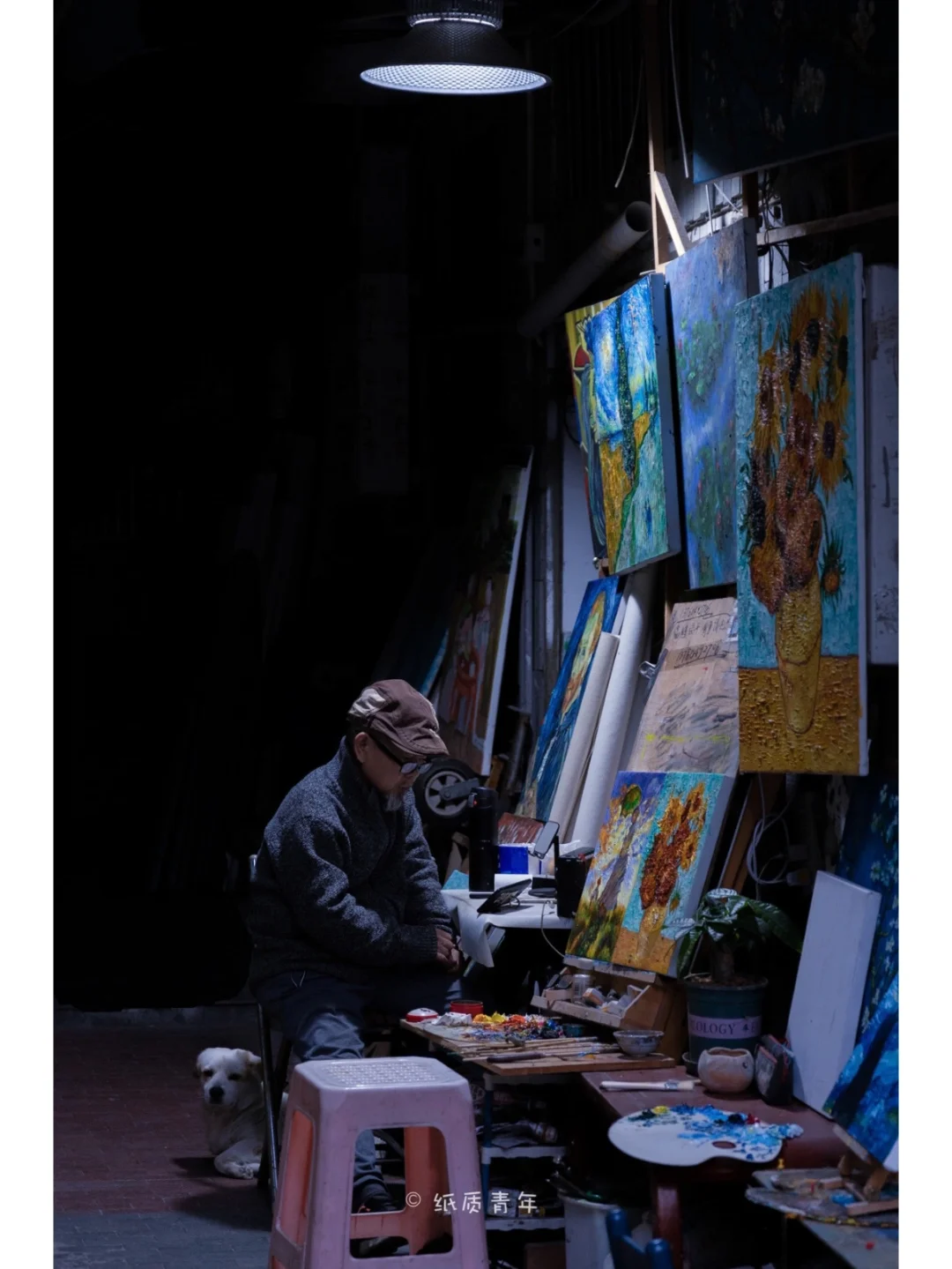油画村的一人、一狗、一画室,看到这个画面的时候非常感动,或许只有旁边的小狗最能懂老人内心吧。
