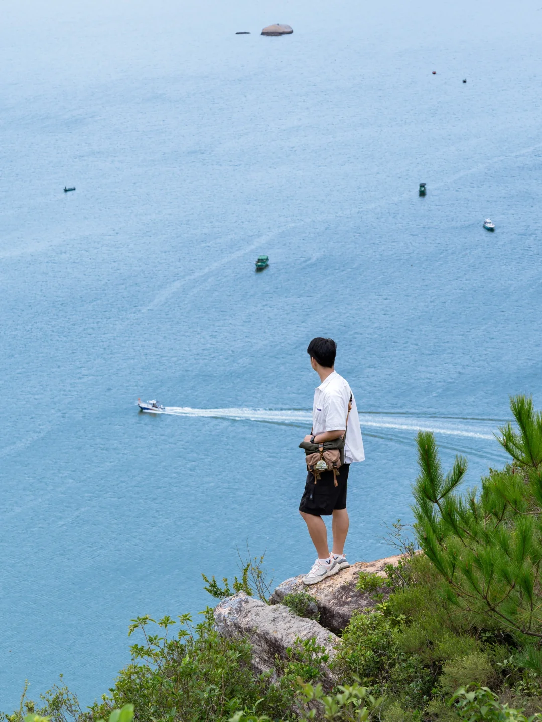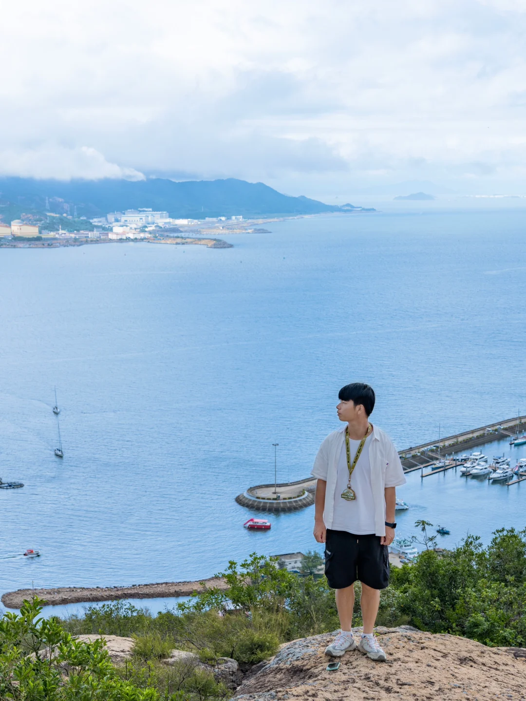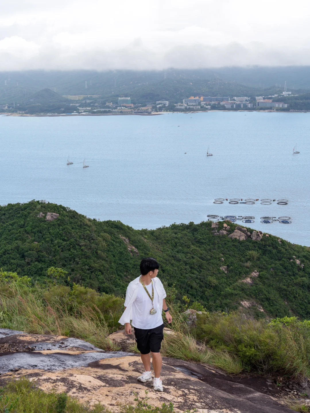 ❸登上山顶三周环海,比较出片的打卡机位是七星湾方向,与较场尾和惠州双月湾隔海相望。