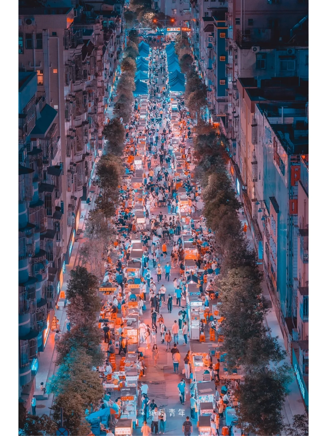 从高处俯拍往往能看到和平时不一样的场景,这次也是主要运用了摄影的二次构图法,把想要表达的夜市街突出,烟火气息显得更加浓重。