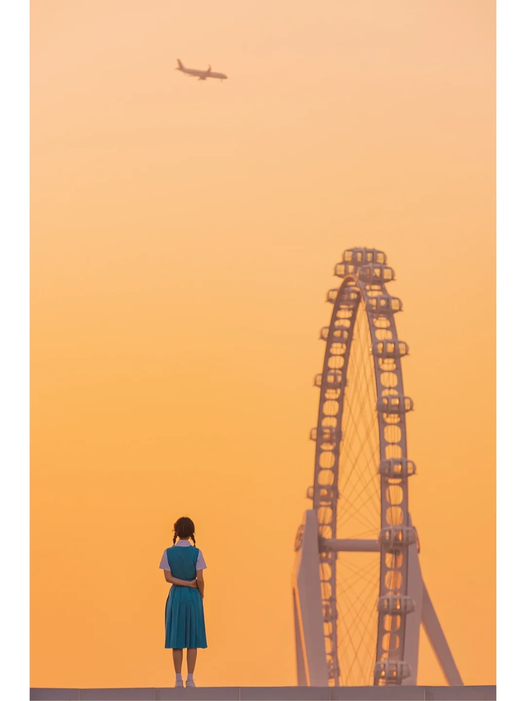 远处的摩天轮可以很好的压缩在斜坡的人物当中,刚好也有飞机飞过,于是有了P2这张图。