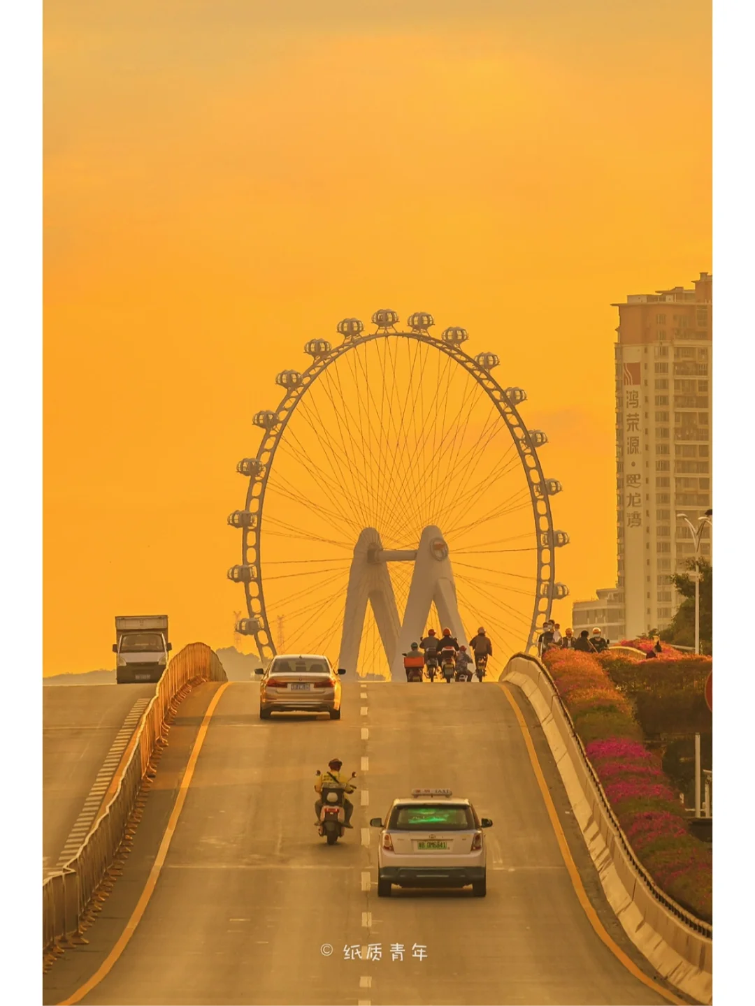 一般肉眼是很难看到摩天轮和公路的衬托,当用长焦把摩天轮压缩进来时,视觉效果瞬间上升了,这是用70-200搭配半画幅裁切后的效果。