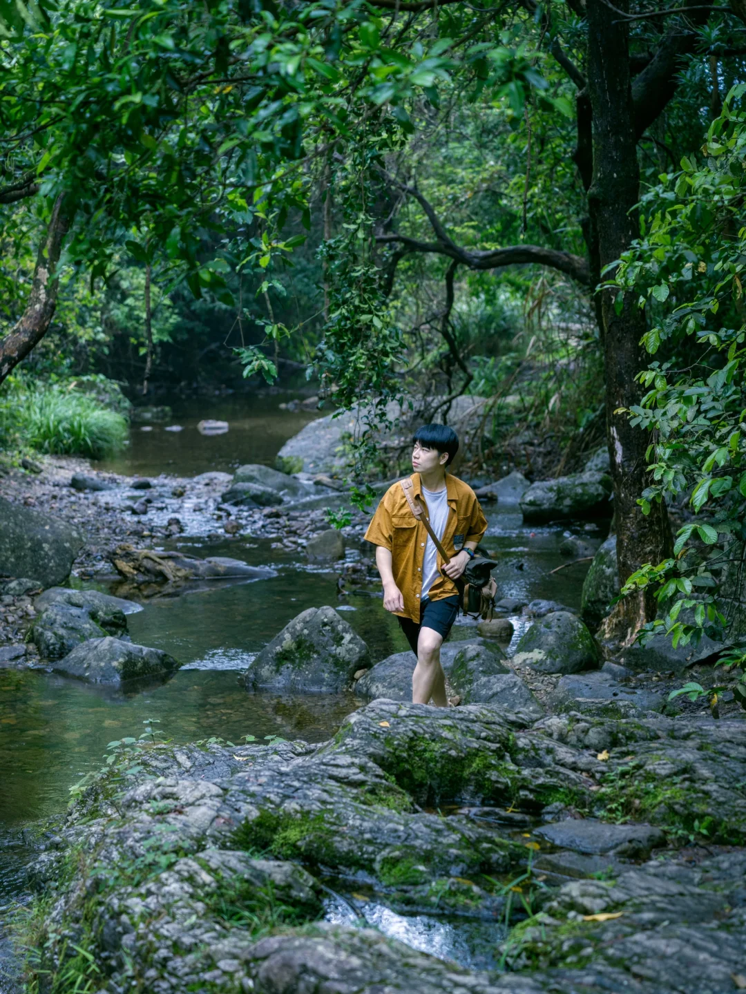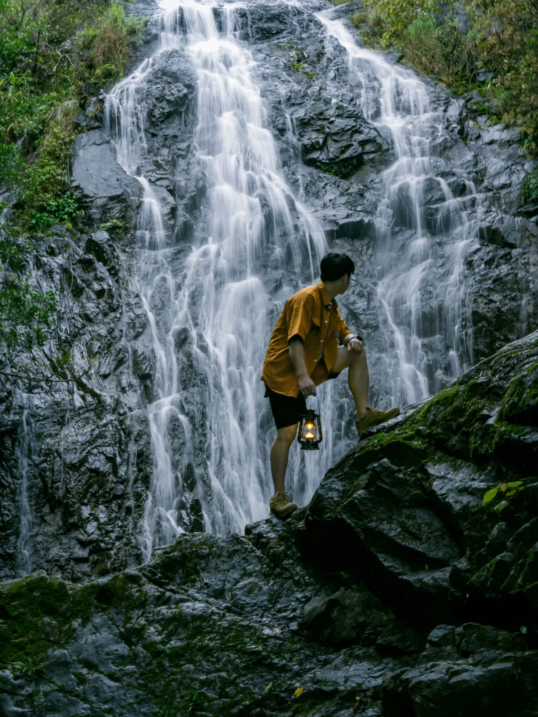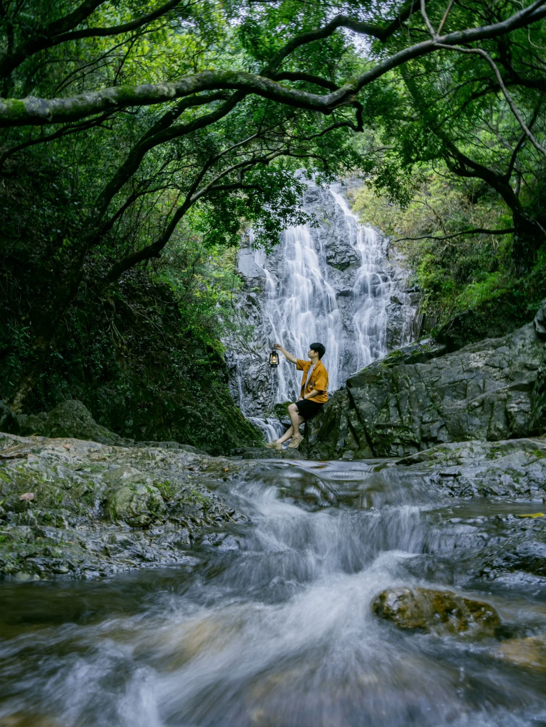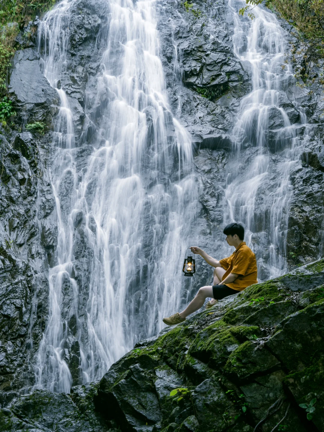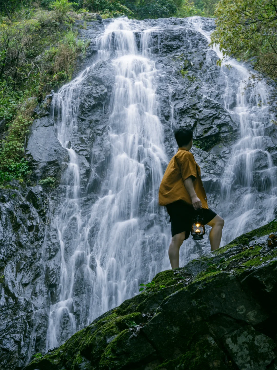 ❹拍摄瀑布的时候可以尝试手持快门1/5秒📷,拍出瀑布丝滑的效果,带一些道具也能拍出氛围感,比如露营灯。