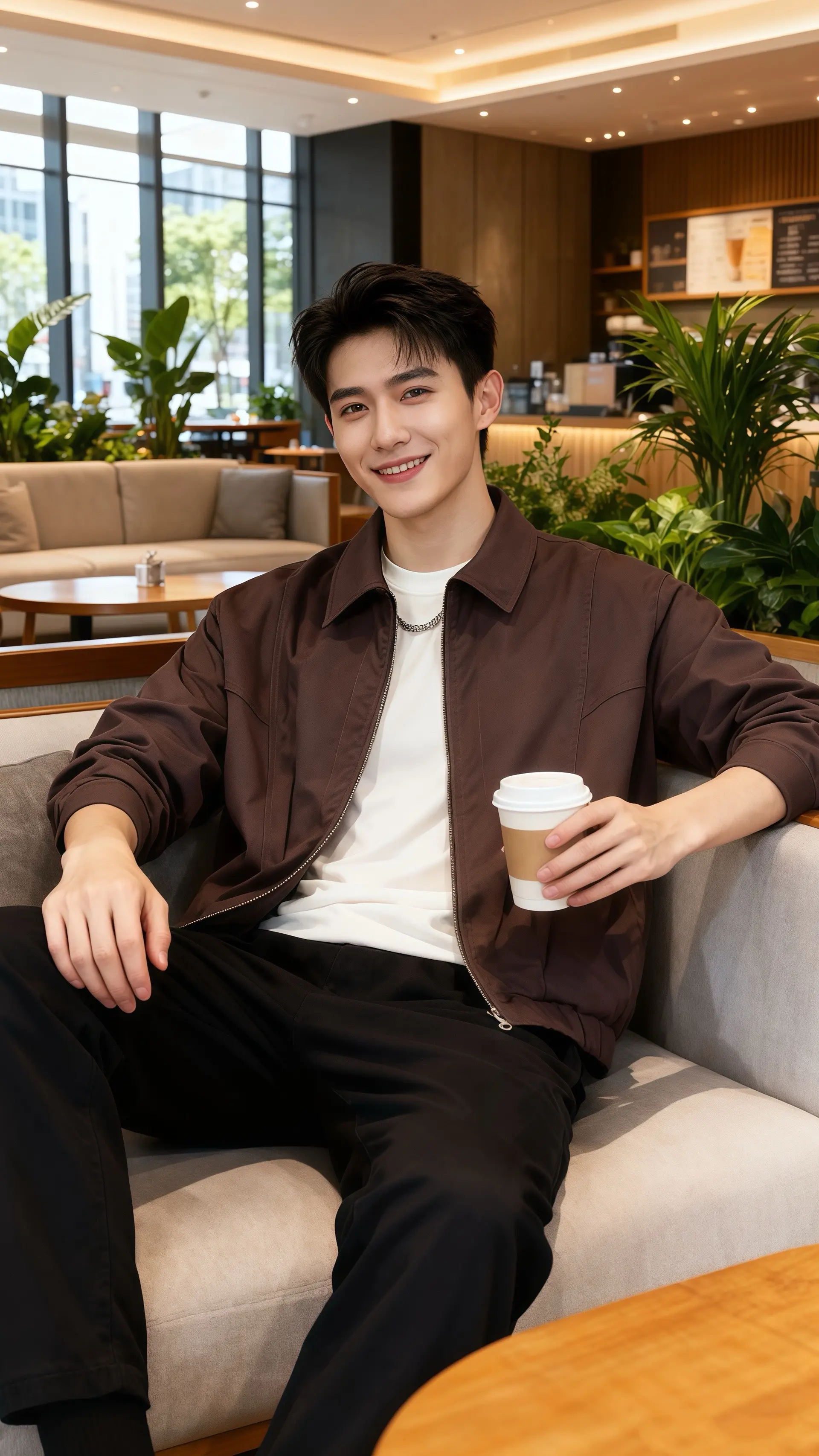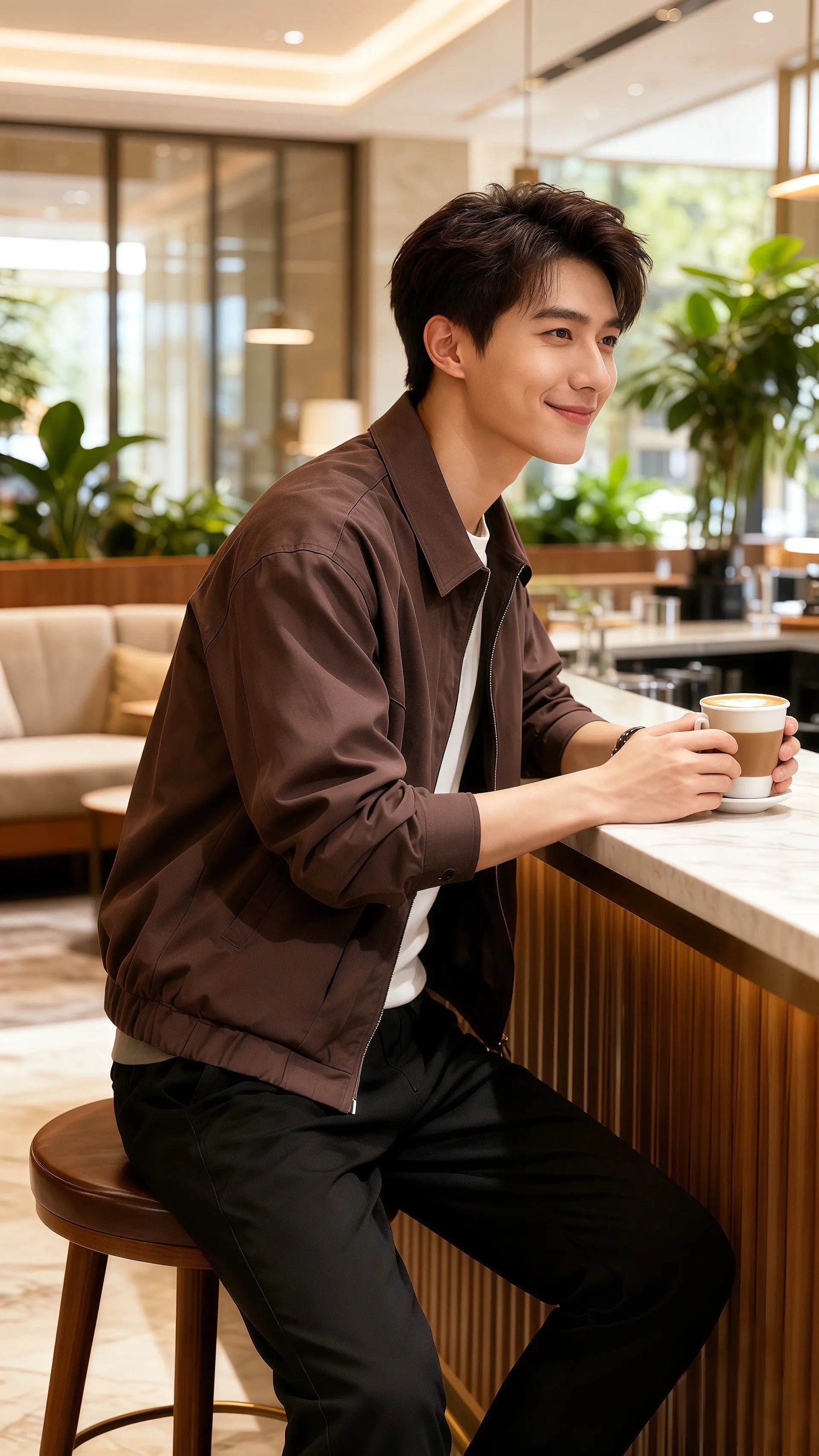 午后的咖啡馆浸在暖光里,许妍推开门时,撞进皓明抬眸的笑意里——他穿的棕调夹克衬着白内搭,领口的线条松而不垮,袖口垂在小臂上,像把秋意揉成了妥帖的温柔。