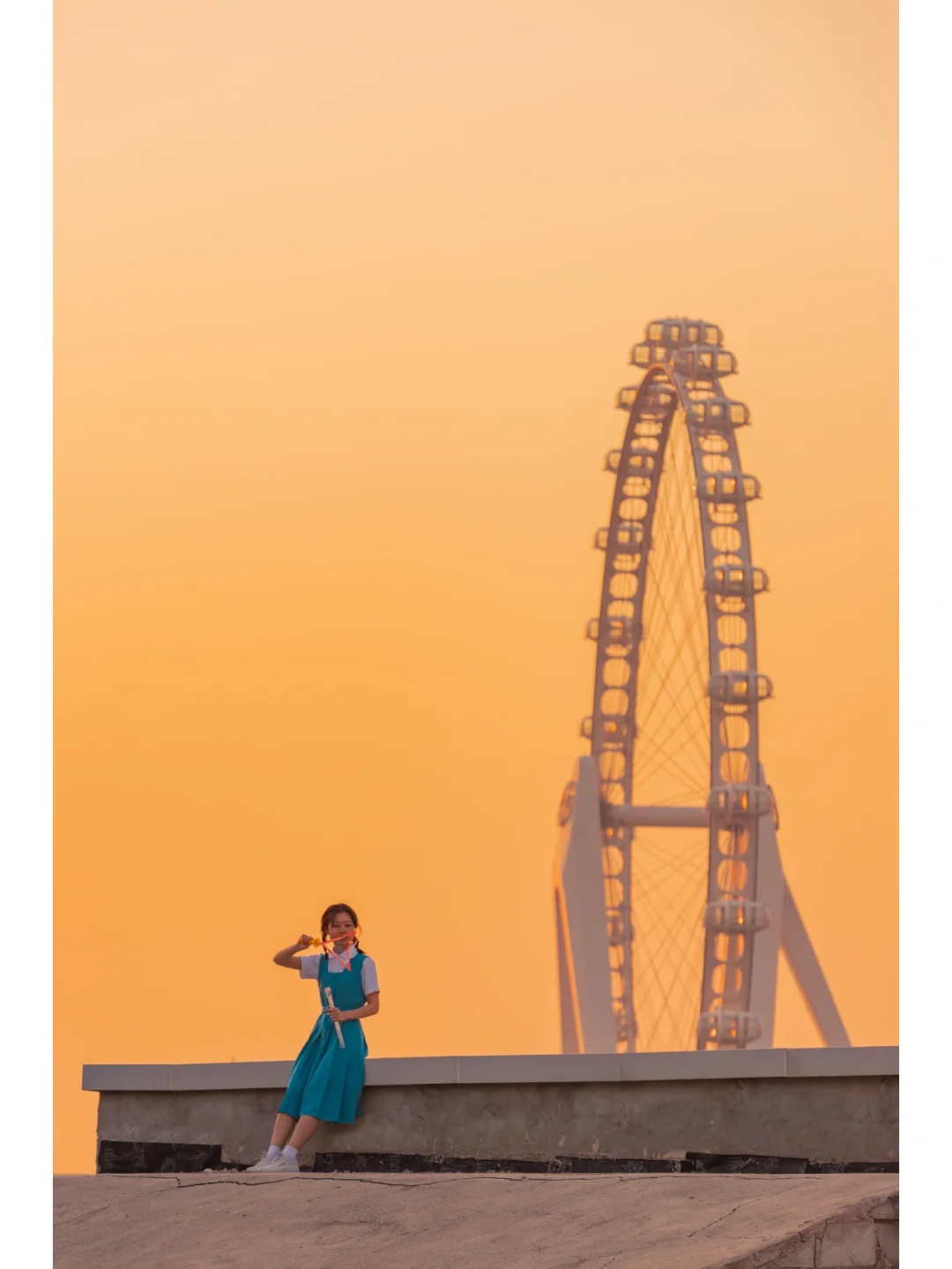 1⃣️1-3的拍摄地点是听海双界河桥处,🚇地铁前海晚站E出口左转红绿灯处,🎡这里是远距离拍摄摩天轮的机位,📷比较适合用长焦拍摄环境人像,这里我选择的是黄昏时间段,突出暖调背景。长焦可以很好的压缩景深,使主题和背景压缩在同一空间上,视觉冲击了更强。