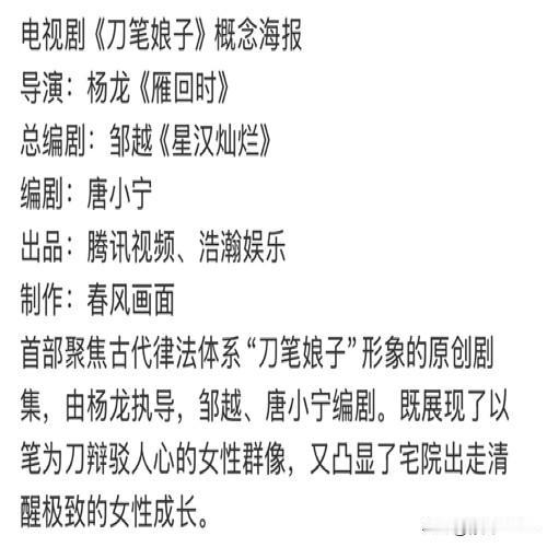 11月9日,这个《刀笔娘子》有点意思! 班底不错《雁回时》导演《星汉灿烂》编剧,我觉得刘涛跟这个角色适配度很高,可惜在主角年纪上存在较大差距,年轻一代女演员里,陈瑶感觉比网传女主夏梦更合适! 相比新人,有一定底子的演员更能演出这个角色的蜕变成长,而且这部剧给我的感觉跟《无心法师》很像,有点喜怖风! 这部剧是今年三大官宣的非重点剧集里,我最感兴趣的,女主拍好了能大出圈!