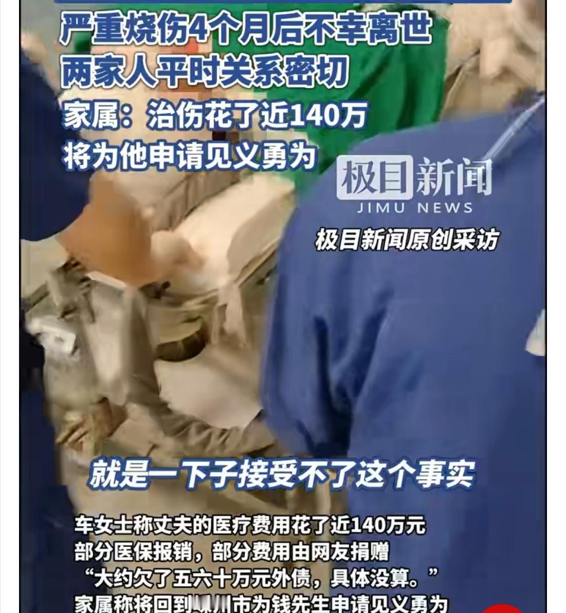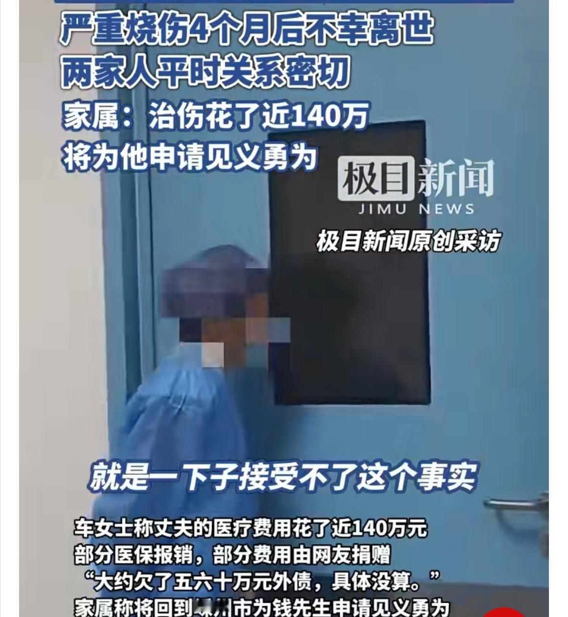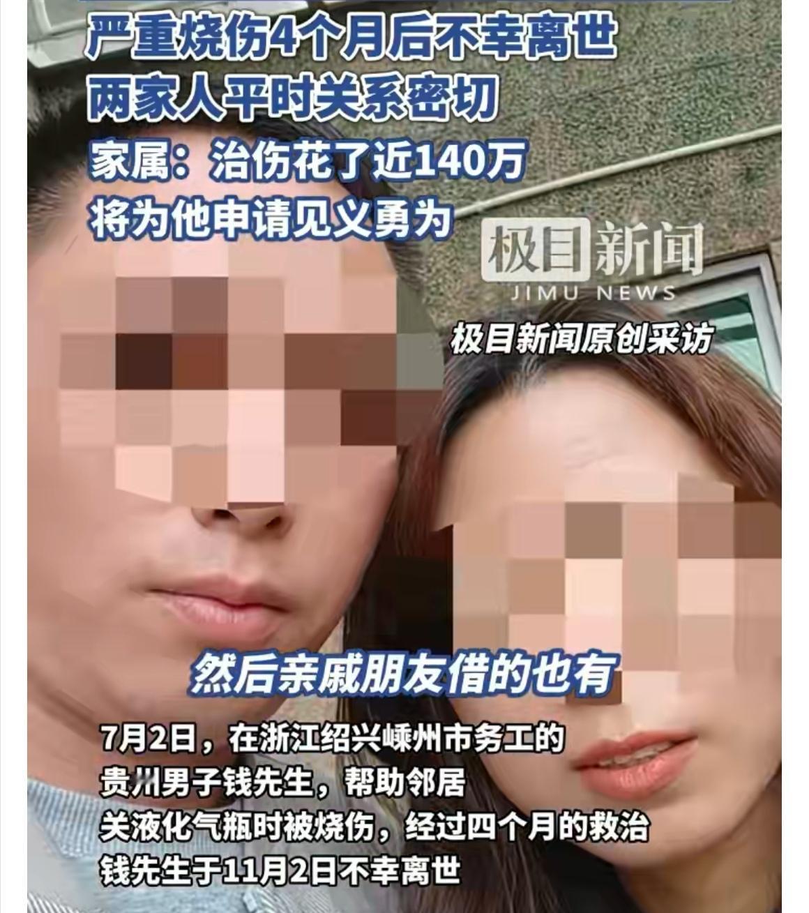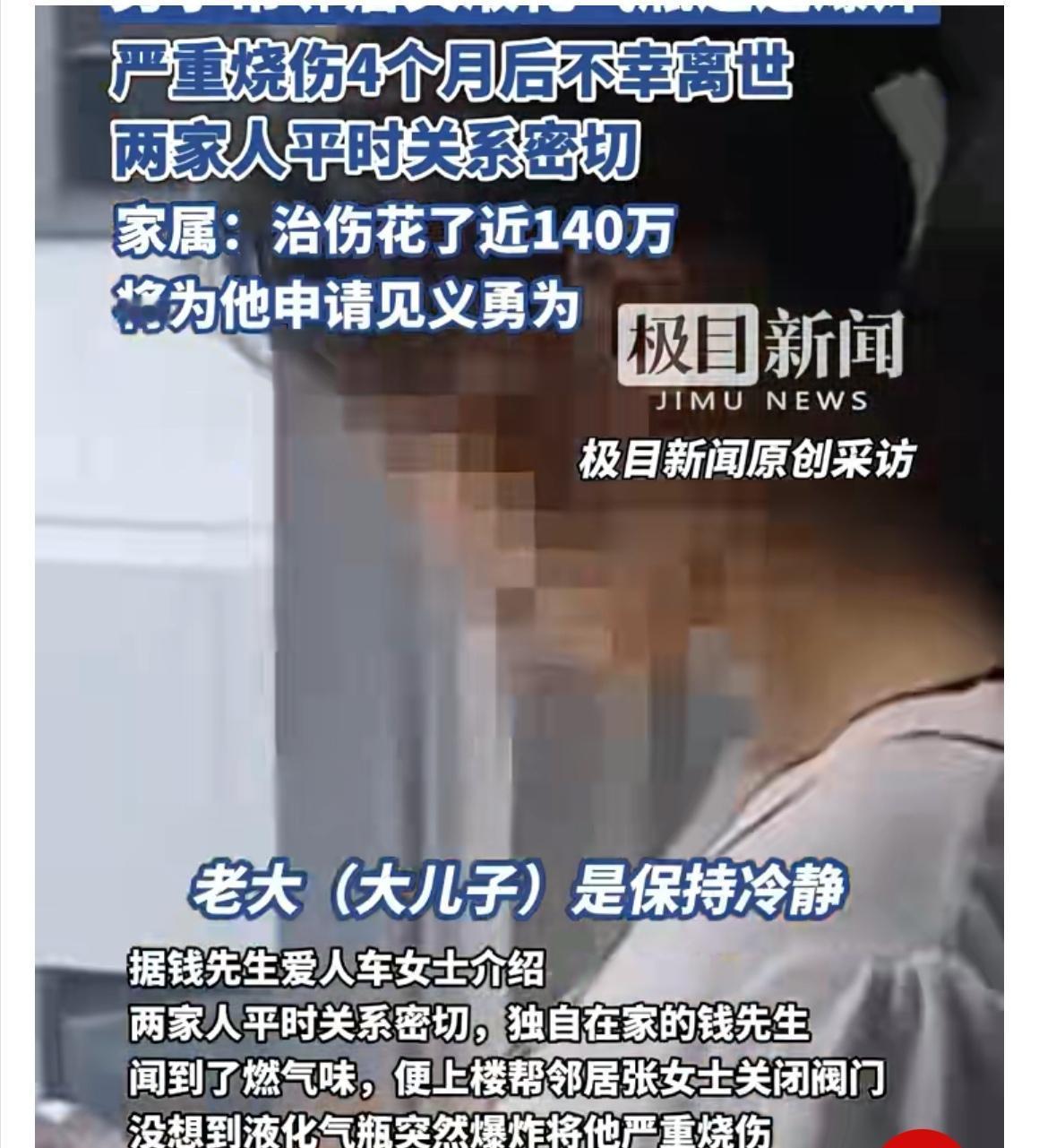 【好邻居关燃气遇爆炸不幸离世,留下巨额医药费令人心碎】 太痛心了!那个因为帮邻居关液化气瓶而被严重烧伤的钱先生,经过4个月的艰难救治,最终还是离开了我们。这件发生在浙江绍兴的意外,最终以最令人惋惜的方式画上了句号。 回顾事发当晚,钱先生闻到浓烈燃气味,主动上楼帮邻居关闭泄漏的液化气瓶。谁知气瓶突然爆炸,瞬间将他吞没在火焰中。当他的爱人和邻居赶回时,只听到他在楼上呼喊:“我被火烧到了,快打120!”下楼时,他全身衣物已被烧光,皮肤惨白,还担心地问妻子自己有没有毁容。 医院诊断显示,钱先生全身高达89%的皮肤被烧伤。在重症监护室苦苦支撑了近四个月后,他于11月2日不幸离世,目前已火化安葬在贵州老家。 更让人揪心的是背后的经济压力——近140万元的医疗费用,尽管有医保报销和网友捐助,家人仍背负着五六十万元的外债。钱先生的爱人车女士说,具体数额她都不敢细算。 据了解,家属在处理完后事后,将返回嵊州为钱先生申请见义勇为称号。这位普通务工者的英勇举动和不幸遭遇,再次提醒大家:燃气安全无小事,在处置燃气泄漏时一定要确保自身安全,最好及时联系专业人员处理。 生命无常,但善良永存。钱先生,一路走好!