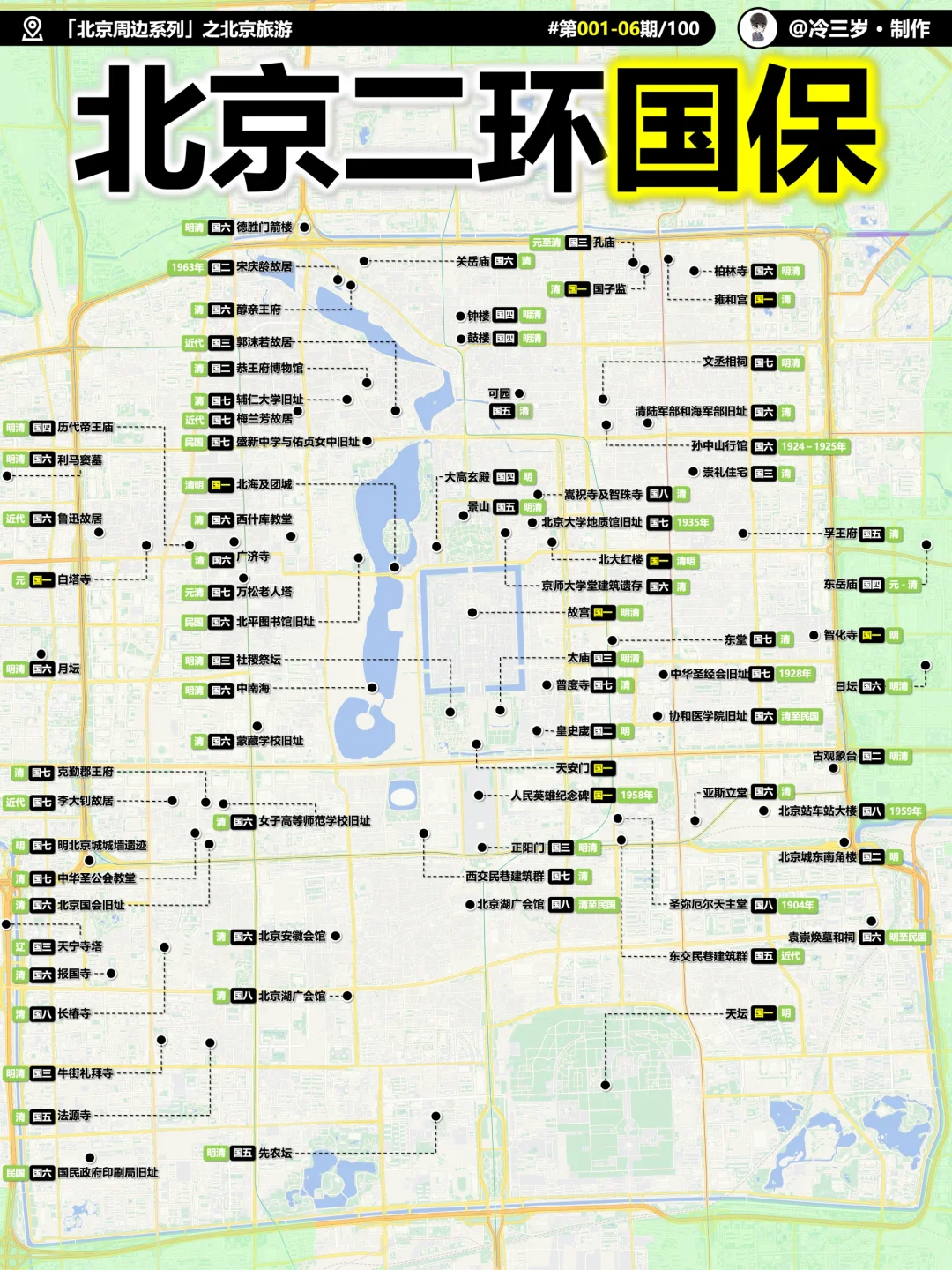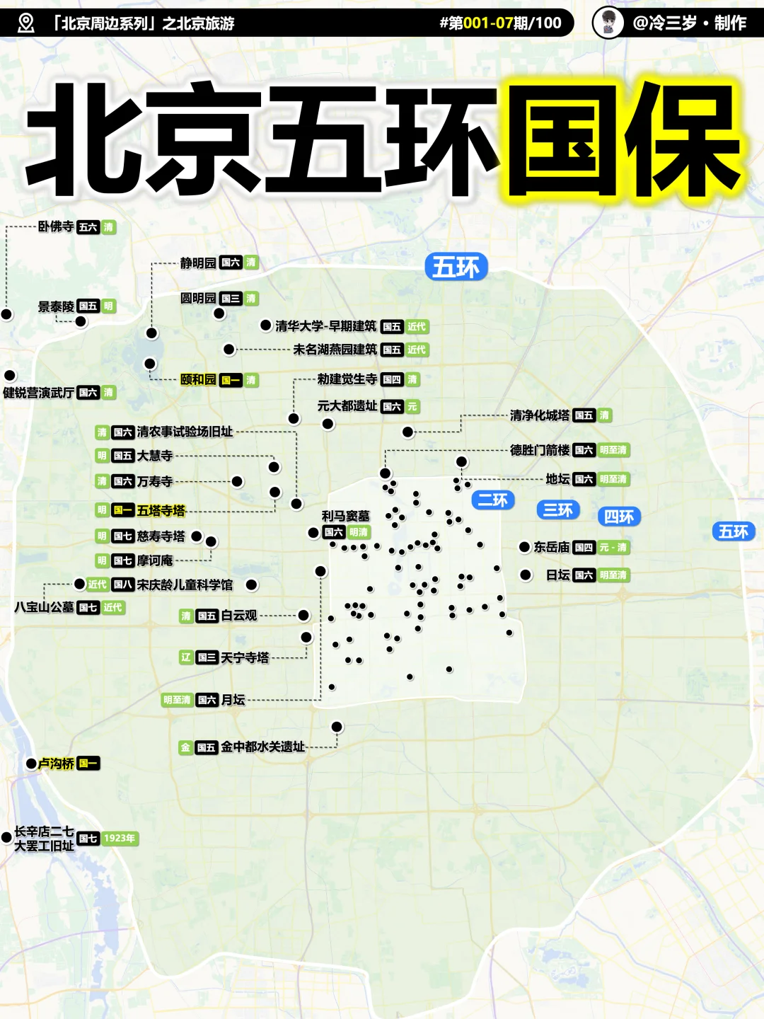 再来一波北京五环内的国保吧 二环太密了,单独做了一张图,图3 二环到五环之间的,图2 [笑哭R]看出来,东南边一片空白 五环内的国保将近100个 试着一张图,实在标不出来,太密了,字太小,没法看。 能去70%的,一定大佬了 上条笔记二环内,惊现了几位基本都去过的(不能进的,在门口也打卡了国保碑) 那五环内的呢[赞R][赞R]