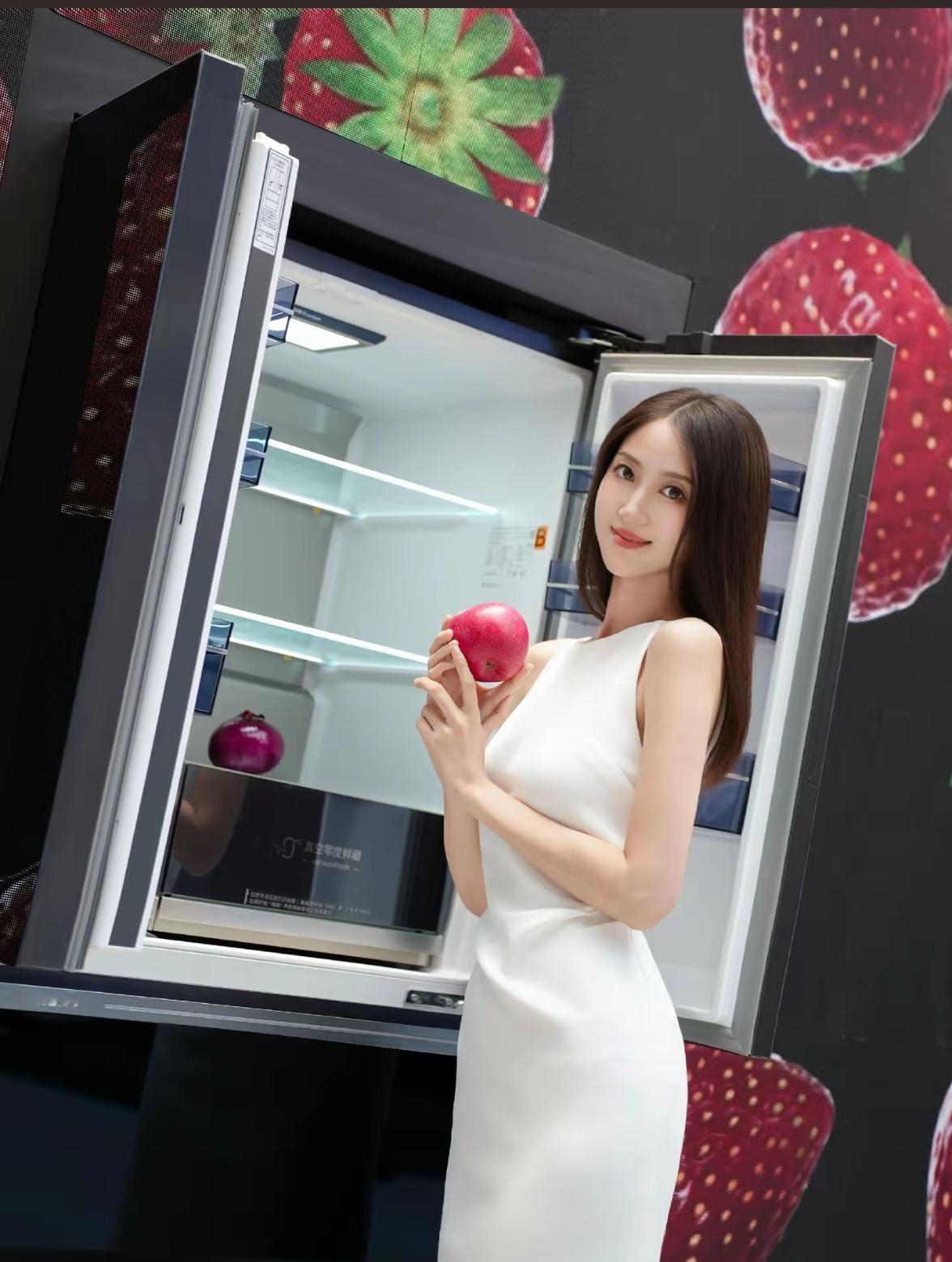 时尚少女与智能冰箱的完美搭配,清新自然,尽显生活品质!🍎🌿