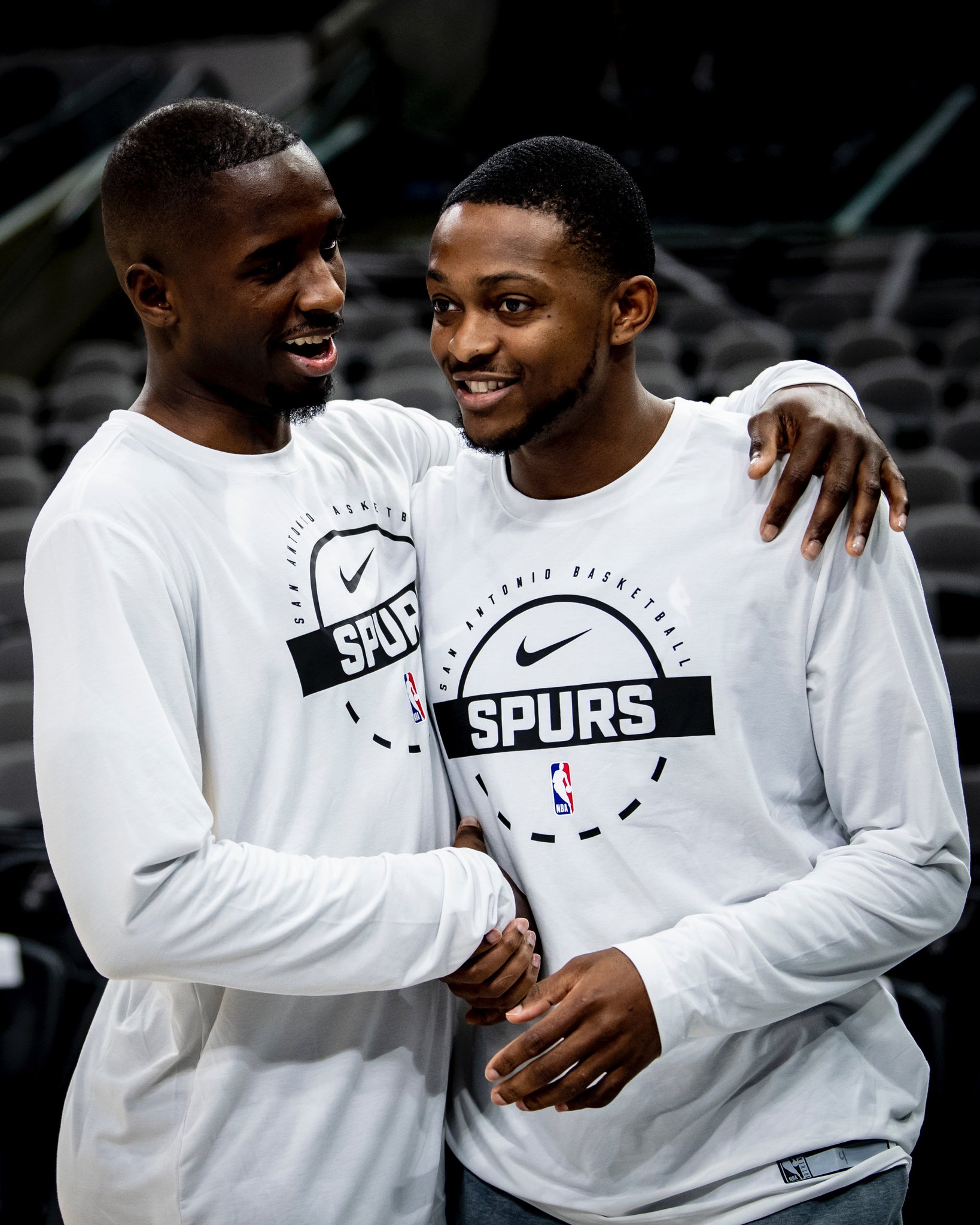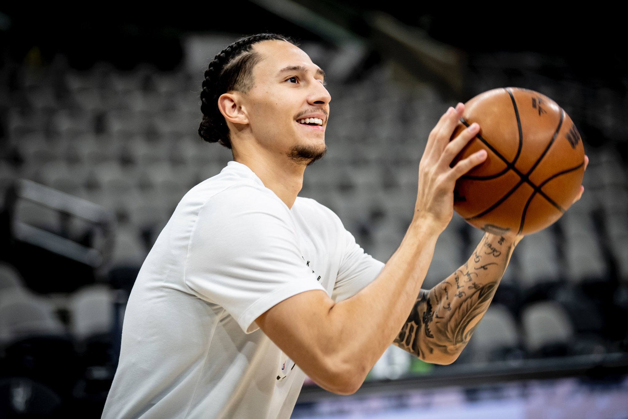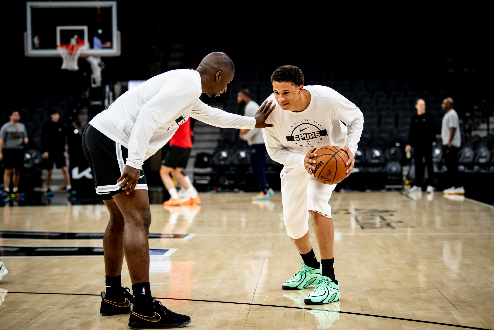 赛前,马刺社媒分享达龙-福克斯在赛前热身时与队友的互动瞬间。