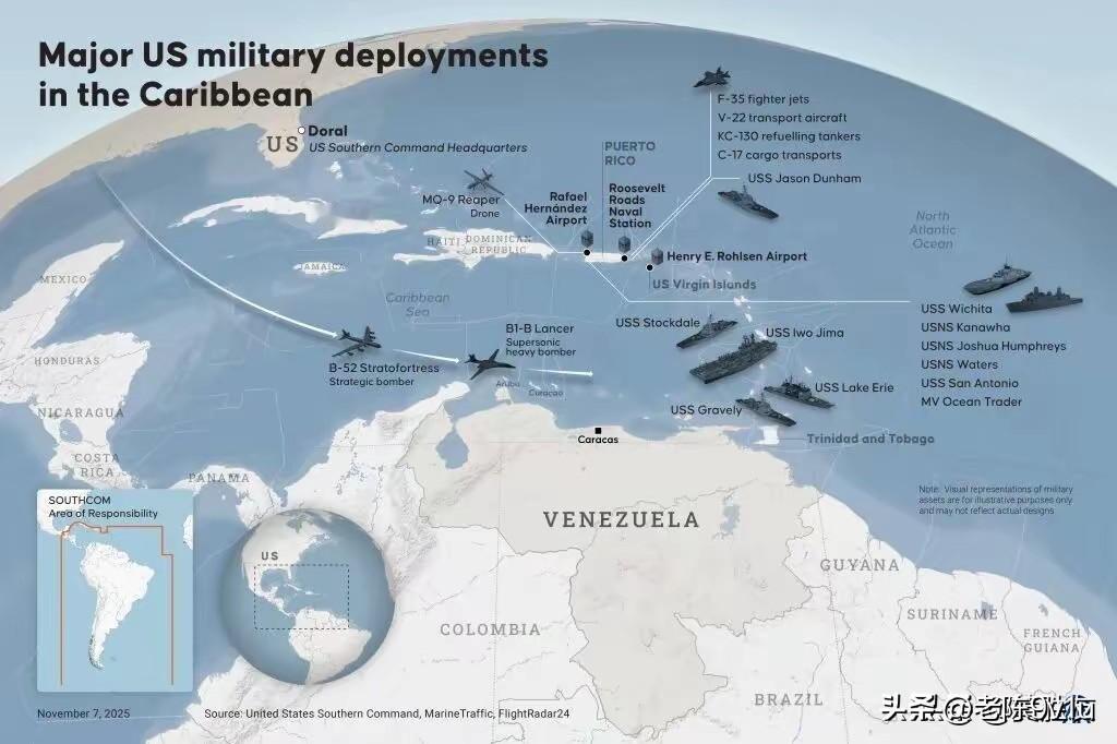 美国在加勒比地区考察增派军事资产地点,推进“强化缉毒行动”目标马杜罗,军事存在和拦截行动或扩大;已部署AC-130、P-8等,“福特”号航母及护航舰在该地区;暂未军事打击但其他选项在考虑;俄罗斯愿援委,俄议员称近期送防空系统,美国对俄舰艇在委附近不满;马杜罗愿弃权换条件,美军部署未放缓。