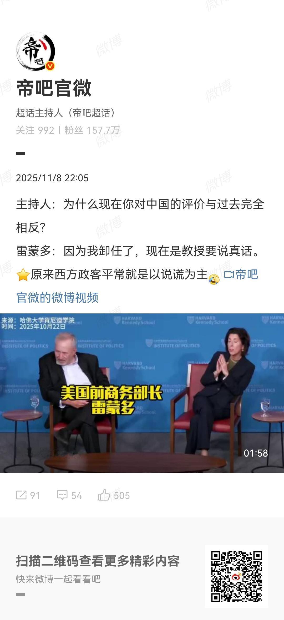 提到中国,美国前商务部长雷蒙多最近在接受采访时,竟然全是称赞溢美之词,她诚恳说道:“中国有一套非常有效的产业政策,我的意思是,正如我刚才所说,我认为,太棒了,太棒了,我的意思是任何坐过比亚迪的车的人,都承认它是一辆很棒的车,工作得很好,这是一件很美好的事情,这是中国产业补贴的直接结果。” “看看华为,难以置信,美国的前两届政府,以为他们可以阻拦华为,结果,华为比以往任何时候都更强大,制造出令人难以置信的芯片,这都是因为它是中国体系内的顶级公司,中国的生物技术也是如此,他们真的在这些领域做出了创新,生物技术,量子技术,因为中国政府把很多钱投入其中。” “还有一件事,我们可以向中国学习的一课,他们投资于人才,中国最近推出了,我忘记了确切数字,但是成千上万的,我们称之为职业和技术学校,就像在生物技术从业者的平均年龄,在美国,制药厂工人的年级大概是55岁,水管工,焊工,电工的平均年龄是50多岁,你知道我们在美国,没有有效的劳动力体系。 “我们鼓励学生接受教育,美国的GI法案保障普及教育,我们送每个人上大学,很多人没有毕业,或者他们毕业了,但他们没有一技之长,中国在劳动力战略制定方面做得很棒,我们想在生物技术上领导世界,但我们甚至没有在大多数高中教分子生物学,所以我认为我们可以从他们身上学到很多东西。” 笔者看完这篇采访,首先感到的是有些惊讶,实在是没有想到,美国这个前商务部长雷蒙多,对中国优点的认知竟然这样清晰,从我们的产业政策到人才政策,侃侃而谈,还搭配以具体生动的例子,还跟美国的情况进行对比,一段话说下来,文字并不长,但却是有条不紊、逻辑清晰地论证出了中国的厉害之处。 之前这个雷蒙多担任美国官员,还没有卸任的时候,可不是这样。笔者现在还清晰地记得,就是在这个雷蒙多访华的时刻,华为推出了mate60手机,当时雷蒙多访华时,气势汹汹,认为美国的制裁打压政策对我们形成了不可抵挡的巨大压力,结果没有想到,我们反手就拿出了mate60,这直接就是打脸了,因此最后只得灰溜溜离开。 雷蒙多也因此被网友玩梗,成为了mate60的“代言人”,在当时火了好一阵子。 这样一个人,在卸任之后,竟然说出了这样理智而又冷静,充满极强洞察力的话语!而且,之前华为推出mate60手机,也算是让她灰头土脸,可是她提到华为时,却丝毫不吝啬赞美之词,直接就说华为比以往任何时候都强大,这一份心胸也是非凡的! 这个只能说明,美国那些精英,他们心里面其实是什么问题都清楚的,只不过在台上的时候,他们却不能也不敢说出自己内心之中的真实看法,就是陪着美国普通民众一起演戏而已。只不过这样做,除了能够巩固自身的权势,还能得到什么呢?对于整个国家的发展,绝对是毫无益处的,只会让整个国家更加衰落。 这可能也就是欧美国家不断衰落的原因之一了,他们的那一整套体系,使得真正有远见、有能力的精英,根本没有办法发挥出自己的能力,只能够在卸任之后,才说几句真话。