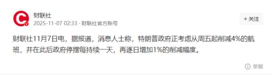 财联社11月7日电,据报道,消息人士称,特朗普政府正考虑从周五起削减4%的航班,并在此后政府停摆每持续一天,再逐日增加1%的削减幅度。 要知道美国联邦政府从10月1日就开始停摆,到现在已经熬到第37天。这停摆可不是闹着玩的,直接断了联邦航空管理局的资金。约1.3万名空中交通管制员和5万名机场安检员工,全成了无薪上班的“冤大头”。上个月28号该发工资的时候,这些人一分钱没拿到,日子根本没法过。 没人愿意白干活,请假的人越来越多。联邦航空管理局一天能接到450起空管人员短缺的报告,是去年同期的四倍。达拉斯、芝加哥这些大城市的枢纽机场,早就出现了航班延误,平均延误时间最短半小时,最长能拖到3小时。联邦航空管理局局长贝德福德都急了,他干这行35年,从没见过这种阵仗,只能咬牙推出削减航班的办法。 当然削减航班不是随便砍砍,这次波及的是全美40座最繁忙的机场,纽约、洛杉矶、亚特兰大这些核心枢纽全在名单里。 从周五开始先砍4%,之后每停摆一天就多砍1%,到11月14号就要砍到10%。英国有家航空数据分析公司算了笔账,这每天得影响1800趟航班,26.8万名乘客的行程全被打乱。 航空公司已经开始动手了,美联航说周五起每天要取消220趟航班,达美航空也跟着取消170趟,西南航空少点,但也有100趟。其实早在6号,就有750趟航班被取消,6400趟航班延误,波士顿和纽瓦克机场的航班平均晚点超两小时。 空管人员的日子更不好过,加州伯班克机场曾经6个小时没人指挥,全靠临时调度才没出乱子。就算没辞职的,也得硬扛,有人连加油钱都快掏不起了。 更有意思的是特朗普政府不想着解决问题,反而在机场放起了甩锅视频。国土安全部长在视频里骂民主党不批拨款,才搞成现在这样。可民主党根本不吃这一套,参议院还驳回了共和党的临时拨款法案,两党就这么僵着。交通部长急了,放话要解雇缺勤的空管人员,可这话说出来,更没人愿意干了。 现在大家最担心的是假日旺季。美国旅游协会已经给国会发了信,要是停摆拖到年底,航班削减得更厉害,到时候不光旅客遭殃,航空物流也得瘫痪。鲜货运不出去,急件送不到,商户得跟着赔本。 说到底,航班砍多少只是表面问题。1.3万名空管要吃饭,26.8万旅客要出行,这些人的需求没人真当回事。两党还在国会里吵架甩锅,可机场的延误提示音不会等,员工的账单也不会等,最后遭罪的全是普通美国人。 来源:财联社