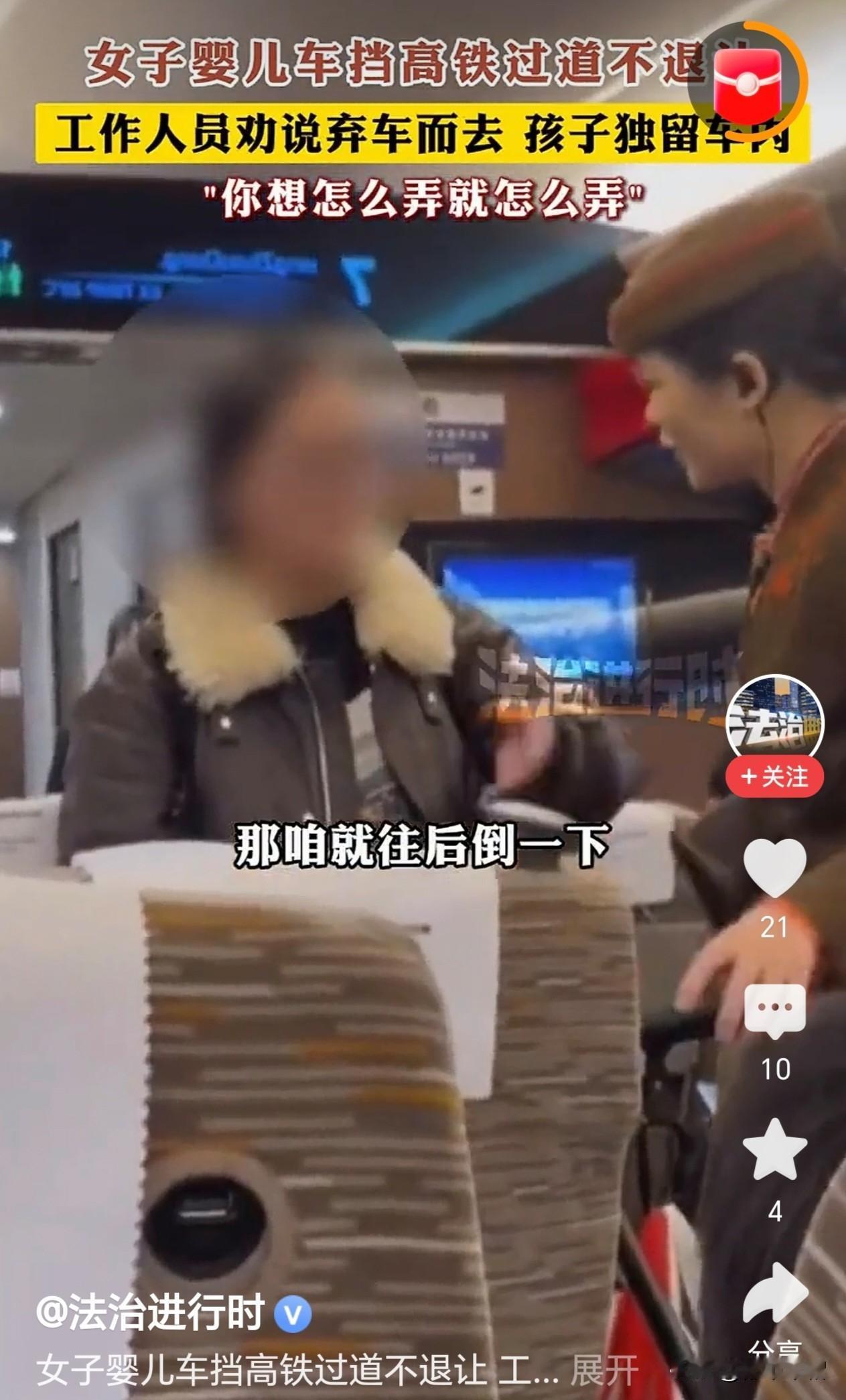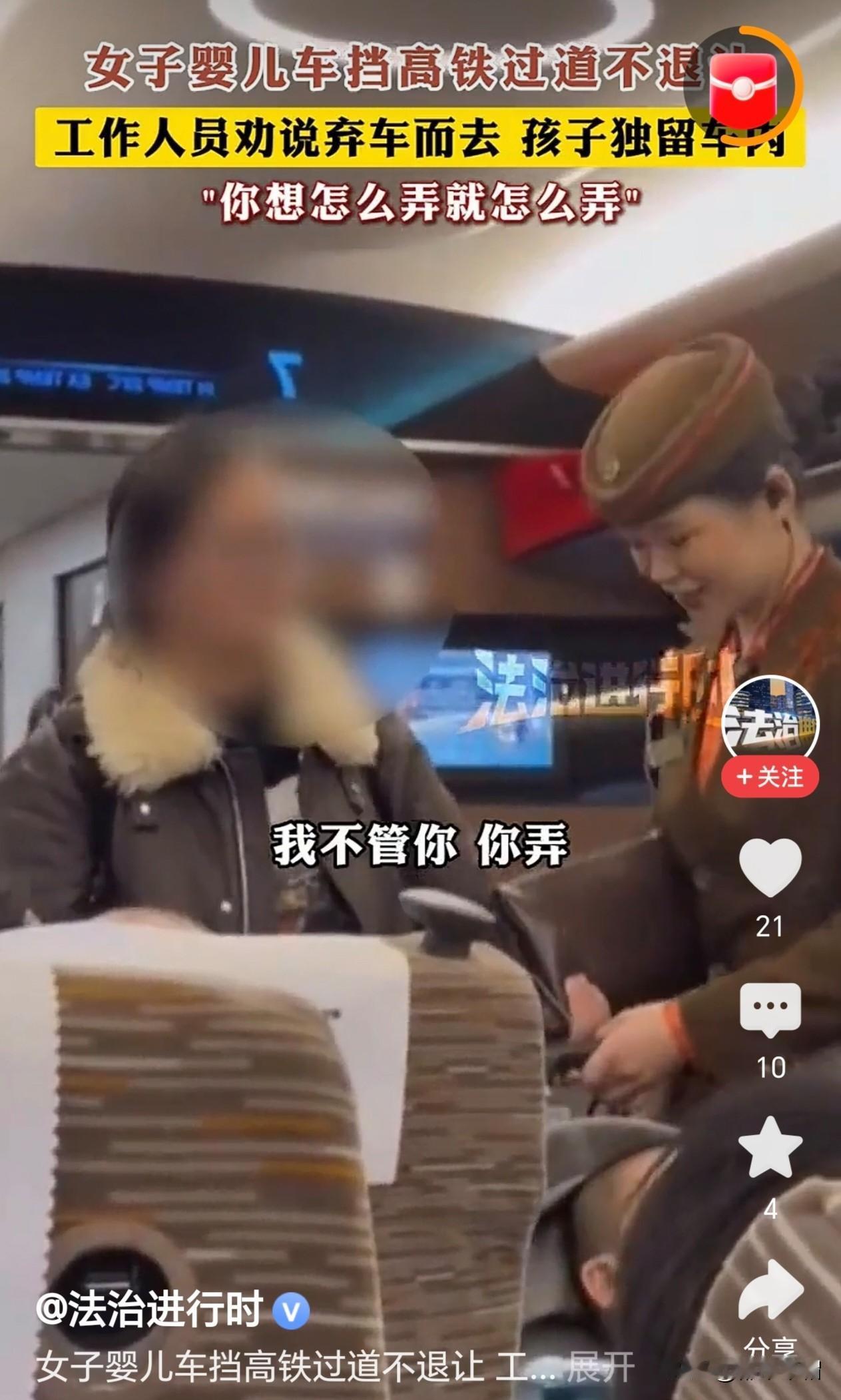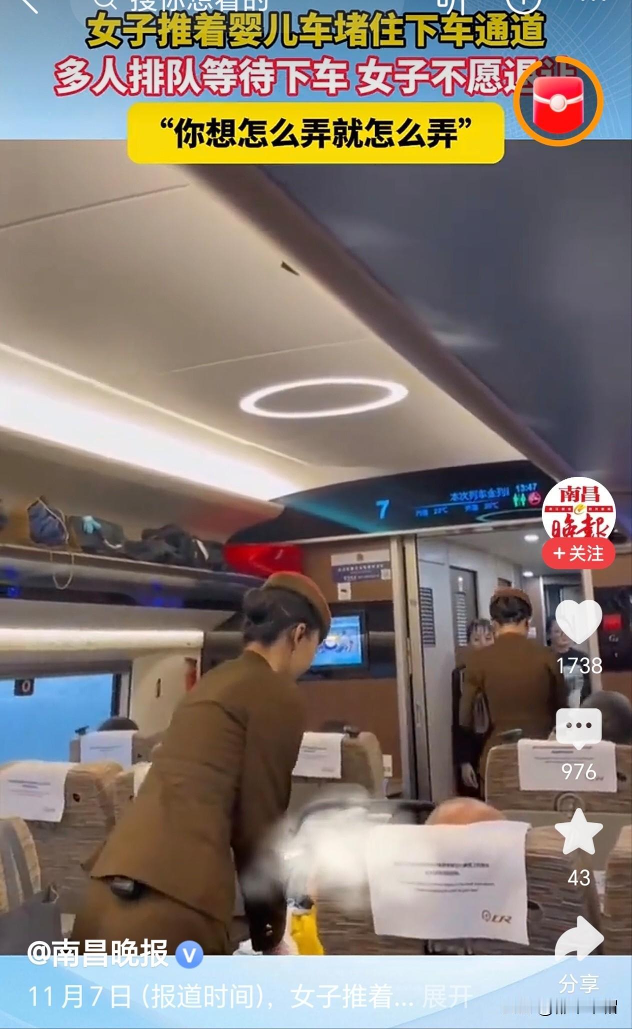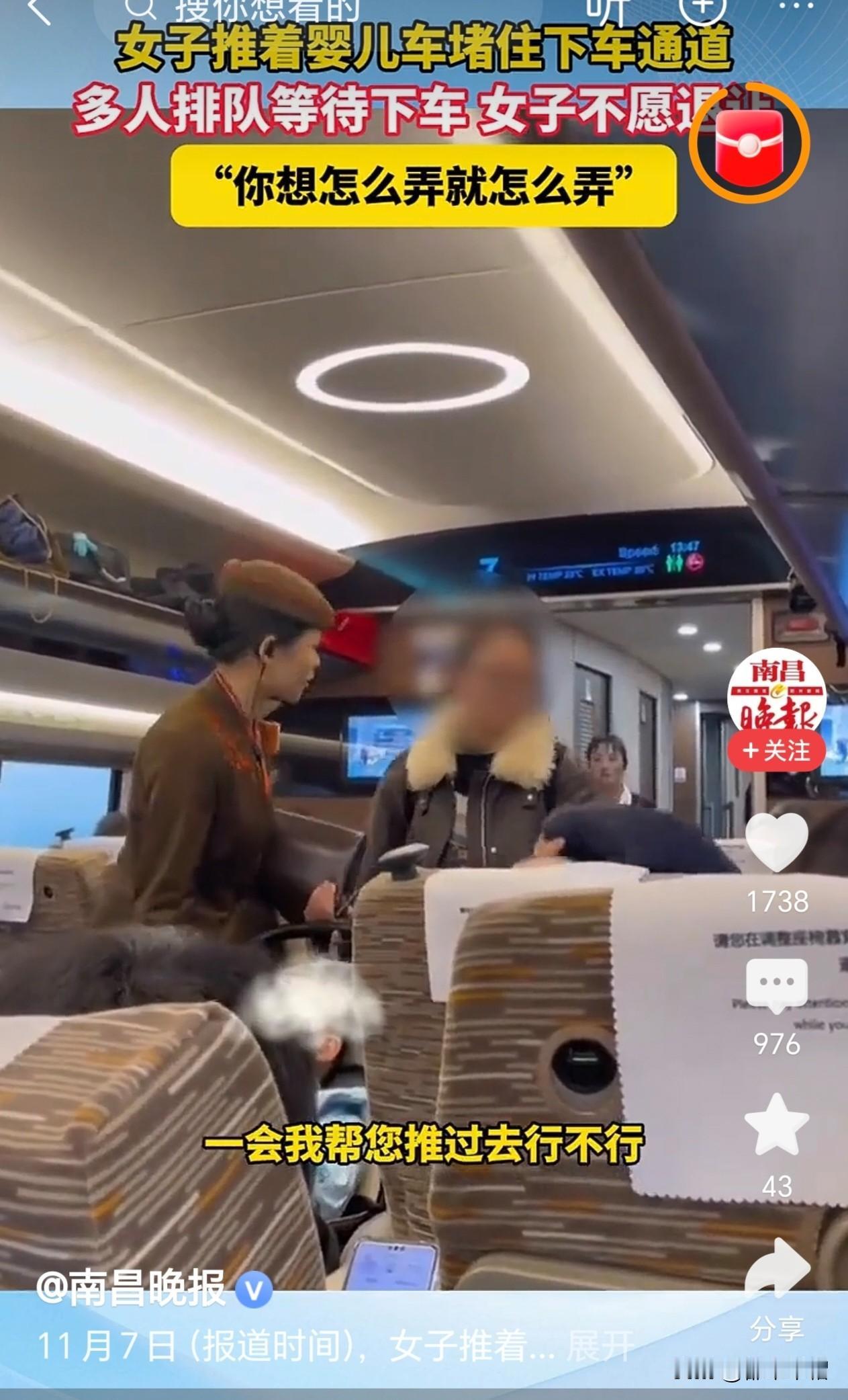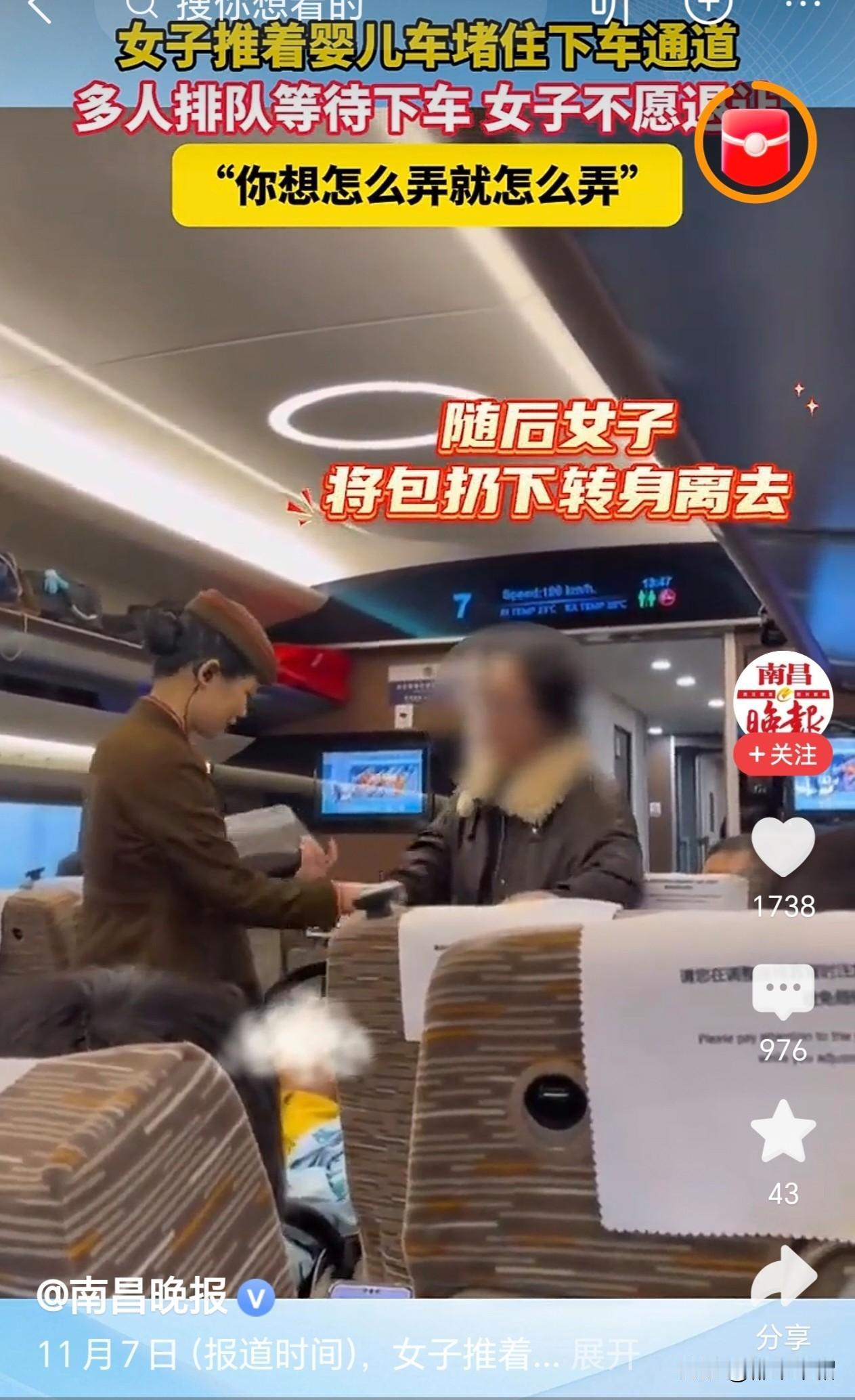 一般人怕惹众怒,可是有人就是要通过惹众怒达到自己的目的。近日,高铁上一女子推着婴儿车堵住下车通道,多人排队等待下车。乘务员跟她沟通,希望她往后倒一下,她不肯。乘务员只好征求她的意见:一会儿我帮你推过去行不行?女人说:我不管,你弄。然后脱下上衣,和把手上的包一起丢在婴儿车上。丢下这一切,自己下车去了。 仗着自己推的是婴儿车,就以孩子之名横行霸道,知道乘务员会因此跟她沟通,于是把乘务员当成自己的丫鬟使唤。也许这个女人觉得自己占了便宜,殊不知自己在全国人民面前丢了脸。也许还会连累自己的孩子,让他们在别人面前抬不起头。 从女人咋咋呼呼的样子来看,她不是因为行动不便才导致堵住下车通道,故意的成分很大。为了自己轻松一点,置全车厢乘客的感受于不顾,这种人是不是太自私,太霸道了?