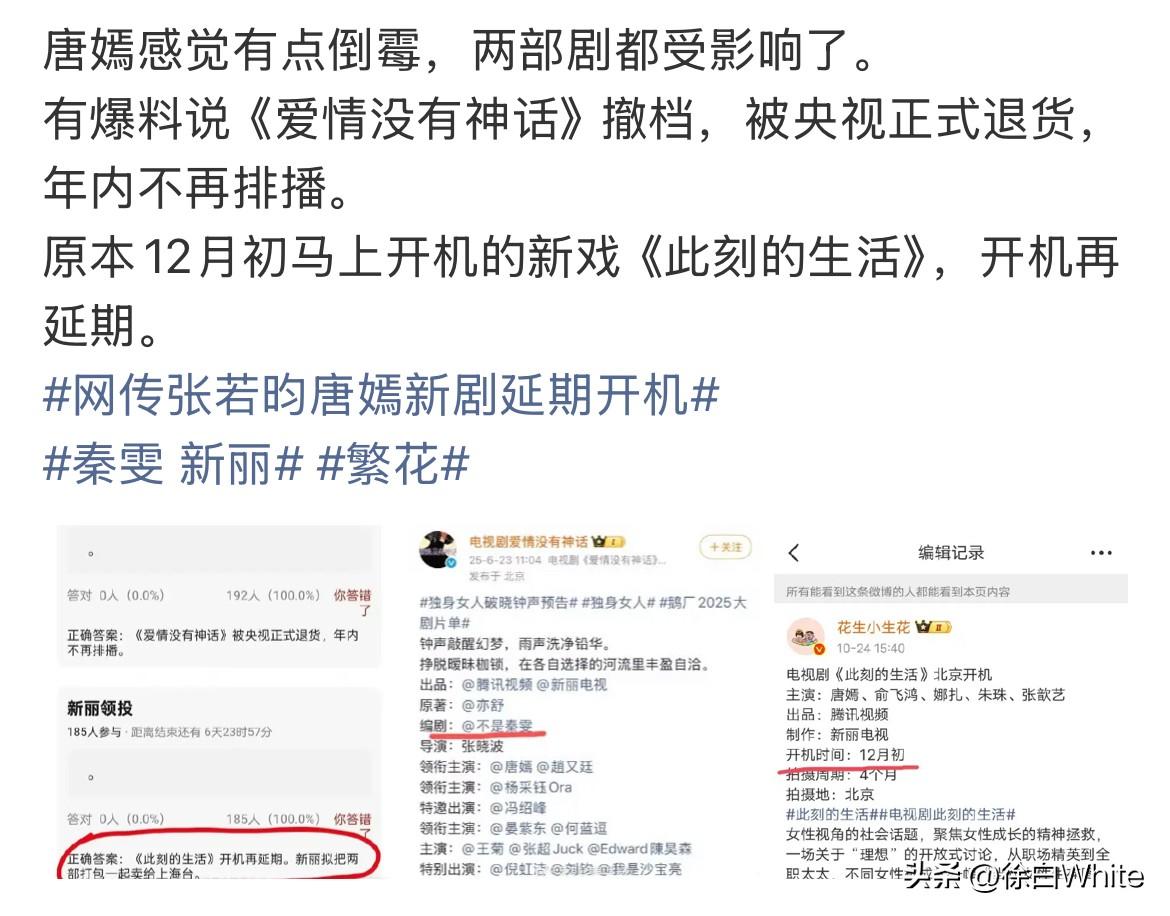 11月9日,唐嫣的剧延期为什么要带上张若昀,唐嫣的剧确实延期了,但张若昀的没有,一直都在按计划筹备中,没必要捆绑营销吧! 唐嫣确实很惨,大家也都很同情她,昨天都在帮她想办法怎样能够保住已经拍好的剧,没拍的剧实在拍不了,也没办法,看看其他本子有没有合适的填个空档,古二王家卫秦雯的事没有解决之前,秦雯挂名编剧的作品大概都会受到影响,既来之则安之,昨天刚说唐嫣不营销,今天就来了,理解但不支持,片方下场了,个人就不要添火了