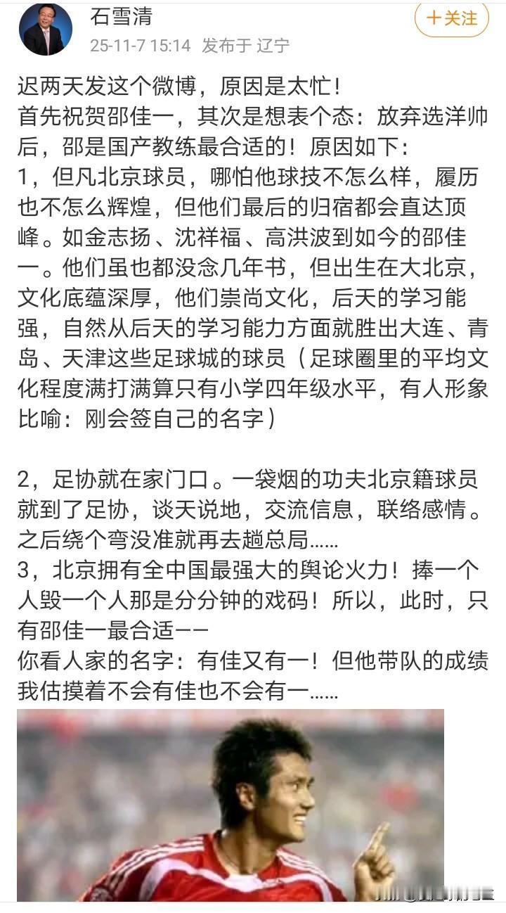 足球经理人~石某某谈论邵佳一挂帅国足!? 这个名字,对于老球迷来说,还真的不陌生,他算是圈内人,但由于不了解,也无法作出具体评论! 单单从他发的这个小作文就可以看出来:石某某到如今的状况,那肯定是有原因的,只可惜,他总是从别人身上找原因,而忽略了自己的品质? 中国足球 中国足球落后的原因 为什么中国足球商业化不成功?