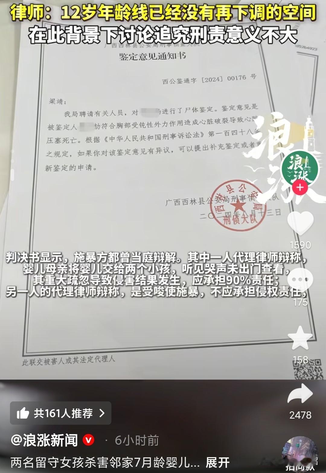 两个不满12岁的女孩去黎先生家玩,为了看孩子哭,摔打7个月的男婴,造成死亡,小小年纪怎么能坏成这样。 念及他们是未成年人(留守儿童),不适判刑、不予立案,要赔偿90万,但就算是如此,家庭没有多少可支出财产,最后赔付10万。 作为监护人,态度不端正一句没钱,小孩不懂事,大人也不懂事,没钱不是你不给的理由,人家已经失去了孩子,理应补偿受害者,不行就慢慢给。 现在妈妈已经得了抑郁症,天天吃药,就因为自己对孩子看管不力,对方律师说要承担90%的主要责任,受伤的是我,孩子没了的也是我,承担主要责任的还是我,凶手只要赔10万元就了事,哪个母亲能受得了这个打击,他们俩还是邻居,以后肯定不会再往来了。 呼吁关注留守儿童教育,未成年人,杀人不判刑,就怕被有心人利用,潜移默化的改变小孩的思想,让他自己产生这个想法,教育尤为重要,出了事监管人不应该承担相应的责任吗?