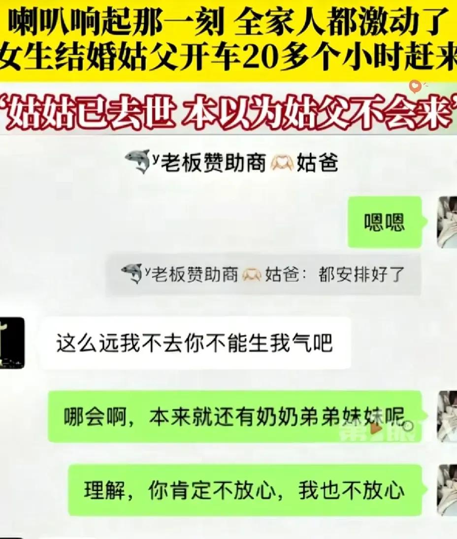 河南驻马店一女子要结婚了,提前几天就把消息告诉了姑父,没想到姑父的姑姑前几天去世了,而且家里还有小孩,没办法到场了,没想到婚礼当天,姑父开着20多小时的车赶了过来,全家人都非常激动,场面感人至深,画面让人泪目。 姑父这么做也许不只是出于礼节,而是深刻诠释了“家人”二字的真正含义。 “家人”不仅仅是以血缘关系相连的亲属,而是以真挚的情感相连的彼此。 麻烦看官老爷们右上角点击一下“关注”,既方便您进行讨论和分享,又能给您带来不一样的参与感,感谢您的支持!