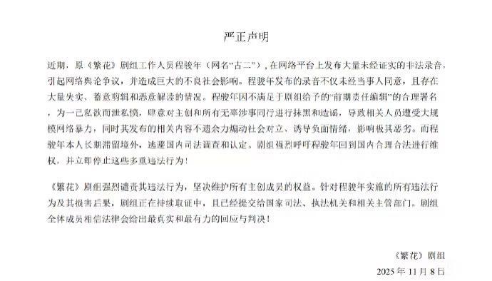 对比《繁华》剧组的三份声明,可以看出舆情的不断升级。 敬请留意、声明、严正声明…