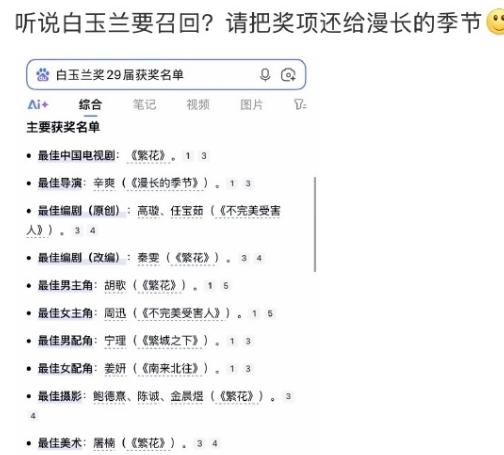 白玉兰被围剿了! 现在很多粉丝希望白玉兰将《繁花》的奖项还给《漫长的季节》,甚至希望三大奖可以将颁给《繁花》的一些奖项收回,白玉兰的调性也就那样了,大家心里都清楚,《繁花》是一部拍摄老上海的作品,找的大部分都是沪系演员,本身就是为白玉兰量身定做的。