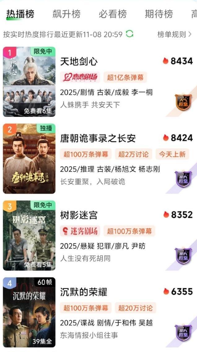 《树影迷宫》云合第一! 谁能想到,廖凡的《树影迷宫》赢过所有顶流一番大男主的作品,已经跃居云合榜首了,排在后面的分别是成毅、龚俊、罗云熙和宋茜,明天或者后天,这个榜单又要大换血了,《唐诡》应该能拿下第一吧。