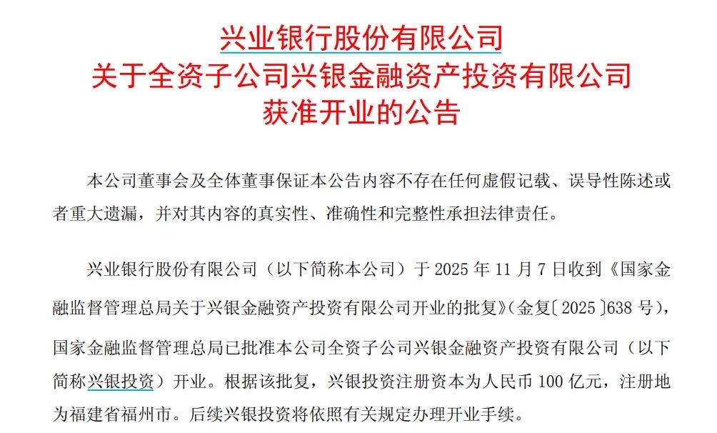 11月9日,兴业银行发布公告称,其全资子公司兴银金融资产投资有限公司(以下简称兴银投资)获准开业,注册资本为100亿元。 兴银投资开业具有多方面的重要意义,以下是对这一事件的解读: ……………………………………… 行业地位突破: 兴银投资是业内第六家获批筹建的持牌金融资产投资公司(AIC),也是首家由股份行发起设立的AIC。 这标志着股份制银行正式参与AIC股权投资试点,打破了此前国有大行对AIC牌照的垄断,是金融资产投资公司领域的一次重要突破。 ……………………………………. 政策响应与战略契合: 兴银投资的定位与国家政策高度契合。 2025年3月发布的《关于进一步扩大金融资产投资公司股权投资试点的通知》将AIC发起主体从国有大行扩展至全国性商业银行,兴银投资的开业是对这一政策的积极响应。 其聚焦科创企业、民营企业,通过债转股降低企业杠杆率,有助于化解债务风险,优化企业资本结构,符合国家发展新质生产力的号召。 …………………………………………. 兴业银行发展助力: 作为银行系AIC,兴银投资依托兴业银行的客户资源,能够更精准地对接企业需求。 其100亿元的注册资本达到行业较高水平,为业务拓展奠定了坚实基础。 AIC业务利润率高于传统信贷,未来可通过资产处置、股权投资创造中长期收益,成为兴业银行新的盈利增长点。 同时,兴银投资的设立补齐了兴业银行在不良资产处置、股权投资方面的短板,与投行、私银业务形成协同,提升了银行对企业全生命周期的服务能力。 ………………………………………… 服务实体经济作用显著: 兴银投资将通过专业化、市场化的债转股及相关业务,加大对科创企业与民营企业的支持力度。 这将有效降低企业的杠杆率,优化企业资本结构,为实体经济注入高质量发展的新动能,助力经济结构优化升级,在服务国家战略、赋能实体经济的道路上发挥重要作用。 ………………………………………