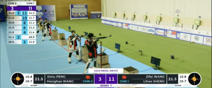 第六轮,快速出手的盛李豪10.9环,王子菲10.8环,彭鑫露只有10.1环,中国一队再夺2分,总比分10比2领先。