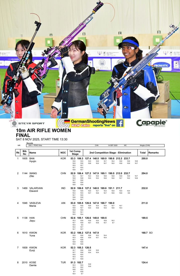 在女子10米气步枪决赛中,王子菲还以254.0环的成绩收获亚军。巴黎奥运会女子10米气步枪冠军、韩国选手潘秀珍摘金,她打出255.0环的成绩,距该项目决赛世界纪录只有0.3环。