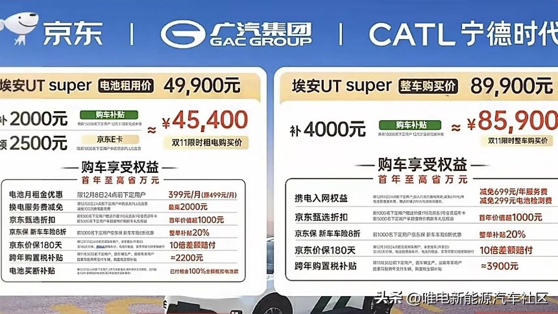 京东联合广汽集团、宁德时代推出的埃安UT super正式上市[思考] 搭载宁德时代54kWh磷酸铁锂“巧克力”电池,CLTC续航里程500km[思考] 电池租用价4.99万元,整车购买价8.99万元[思考]提供2000/4000元的双十一限时补贴,京东PLUS会员也能发挥作用[吃瓜群众][吃瓜群众][吃瓜群众]