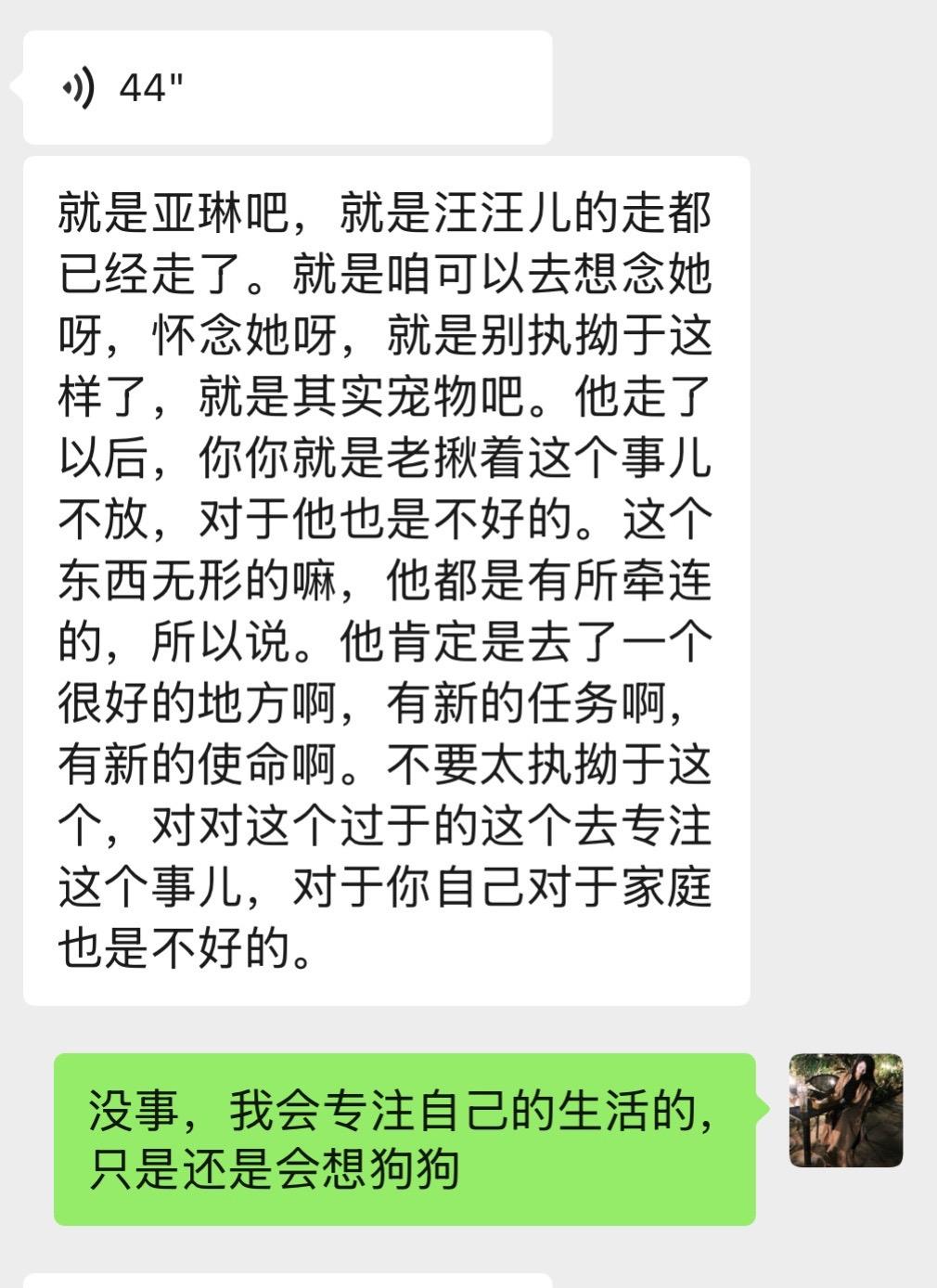 思念就是哪怕心里不相信宠物沟通,还是问了。宝宝,其实妈妈不相信宠物沟通。但依然忍不住想去问问,哪怕不是真的,也想知道别人会通过你的口吻和我说什么?假装宝宝也好。宠物沟通师说可以问5个问题,妈妈想了很久都很难凑齐5个,其实妈妈没有那么多问题。妈妈只想说,我们很想你,大家都很想你,你真的很棒,我们都在期待未来的相遇。