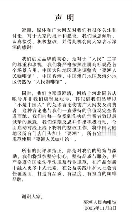 近日,一家以“人民咖啡馆”为名、以红色元素为主题的连锁咖啡店在社交平台迅速走红,引发广泛关注与争议。 醒目的“毛体”招牌、红五角星装饰、“人民咖啡为人民”等标语,让不少消费者误以为其具有“官方背景”。 人民网评论指出,“人民”具有公共与政治属性,不应被商业滥用。 面对舆论压力,品牌方发布声明致歉,并承诺整改,仅在中国大陆调整名称,港澳台及海外仍沿用原名。 此举被视为规避法律与舆论的“区别式整改”,被批缺乏诚意,暴露出国潮营销中公共符号商业化的边界问题。 当然,这件事主要还是热度太高了,影响太大,连央媒都出评论文了,所以哪怕开这咖啡馆的再有所谓的“背景”,也得怂! 该次事件是公共符号商业化引发的价值保卫战。 “人民”二字承载国家根基与集体记忆,其严肃性不容消解。 品牌更名仅是合规第一步,能否真正重塑信任,取决于后续是否彻底摒弃投机营销,以产品品质与社会责任赢得市场! 对此,你怎么看呢?
