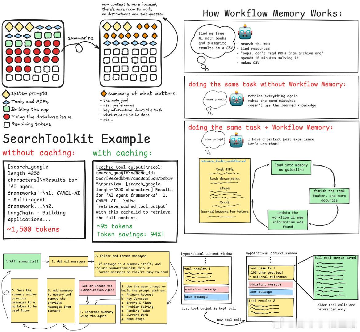 当上下文窗口快满,或代理被“支线任务”干扰,摘要技术能提炼对话核心,删减无用信息,保持记忆清晰。CAMEL支持自动触发、手动调用和工具辅助三种摘要方式,且通过精心设计的摘要提示词,确保关键信息完整且准确——包括用户主请求、未完成任务、当前进展等。摘要还能为后续会话提供简洁回顾。