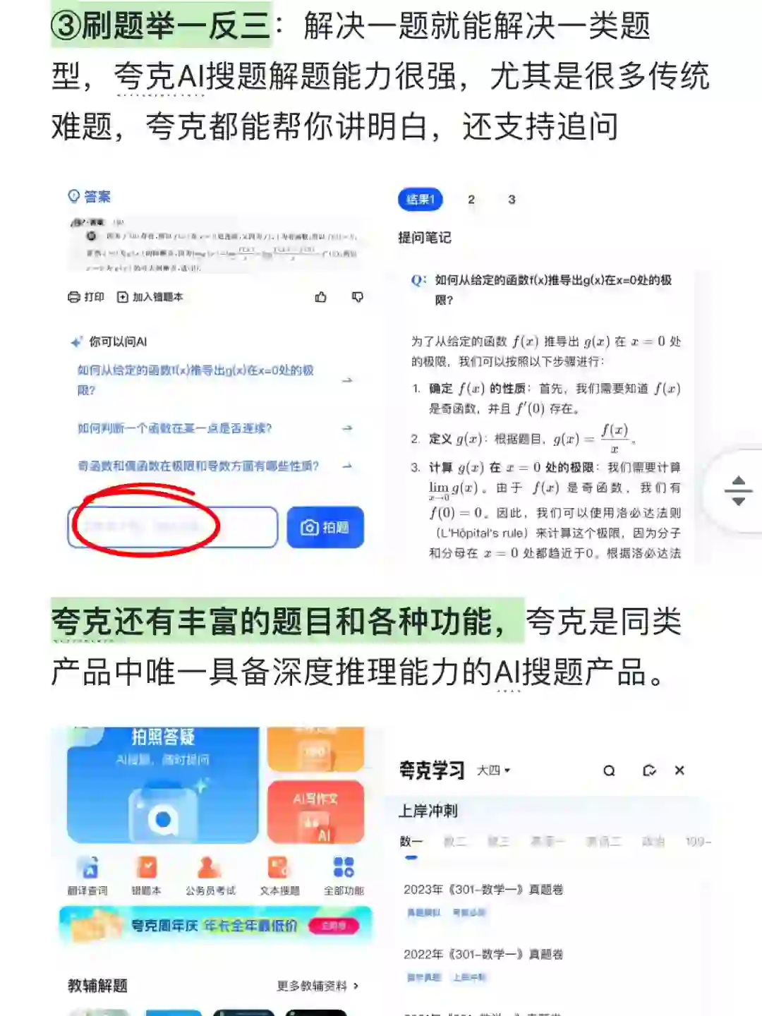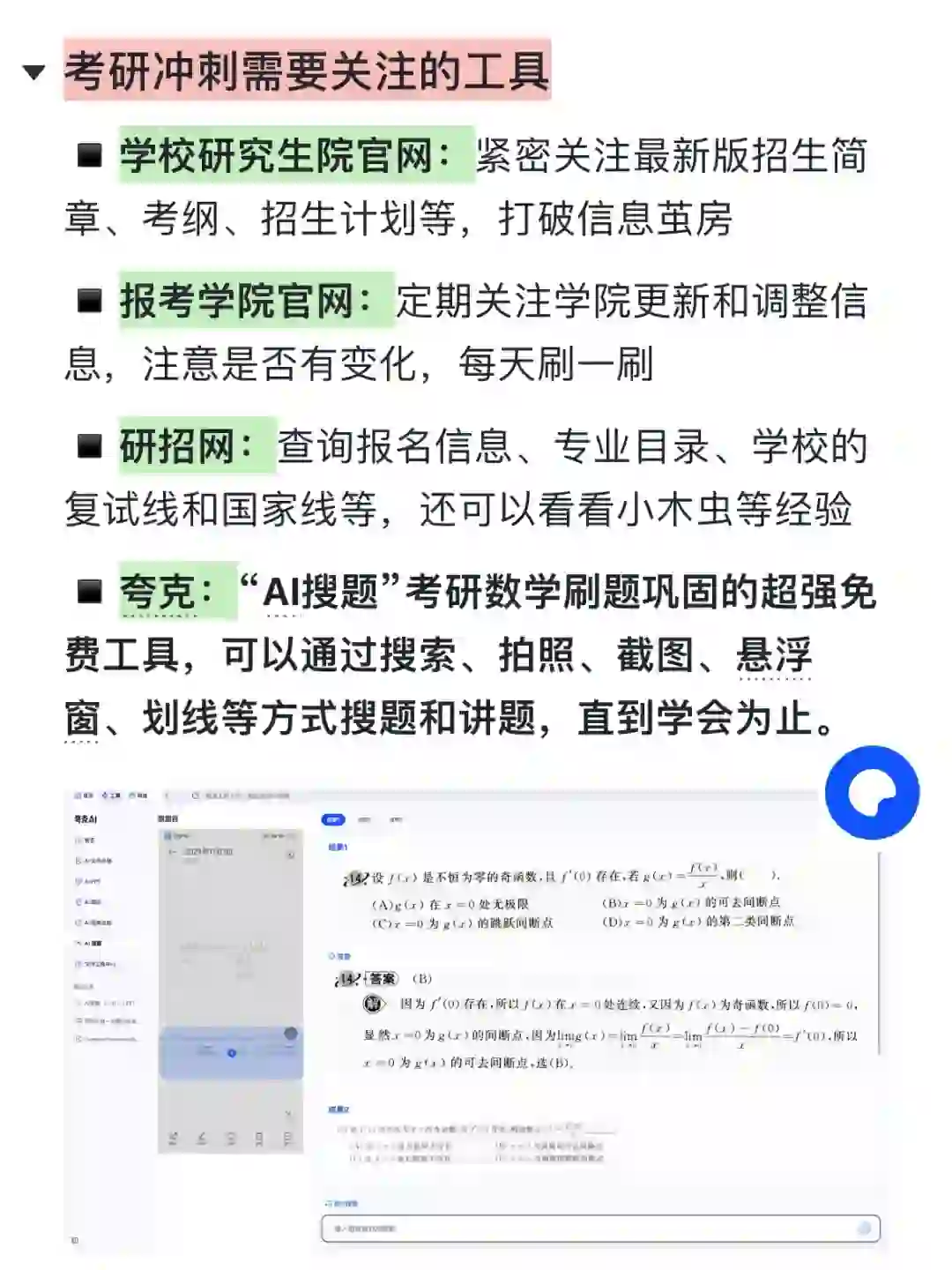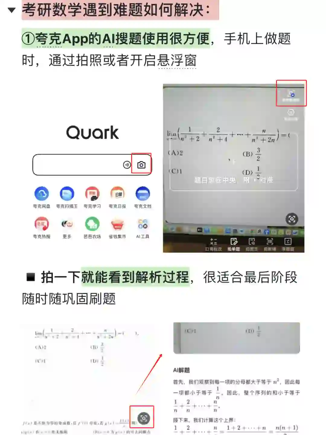 ▪️夸克:“AI搜题”考研数学刷题巩固的超强免费工具,可以通过搜索、拍照、截图、悬浮窗、划线等方式进行搜题和讲题,直到学会为止。